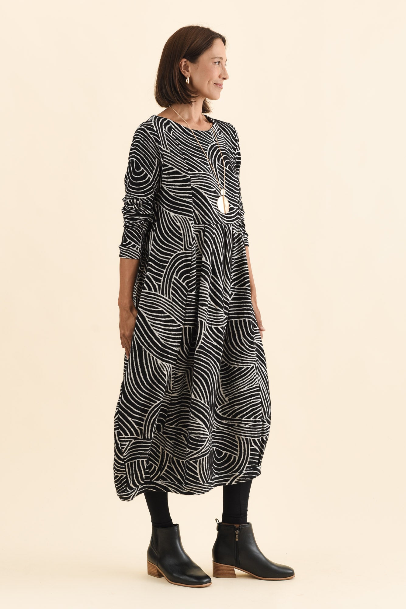 Abstract wavy stripe print in cream on a black base