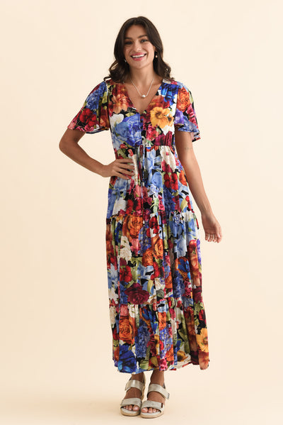 - A-line silhouette showcases a drawstring tie for a custom hourglass fit and a sweet tiered skirt