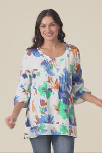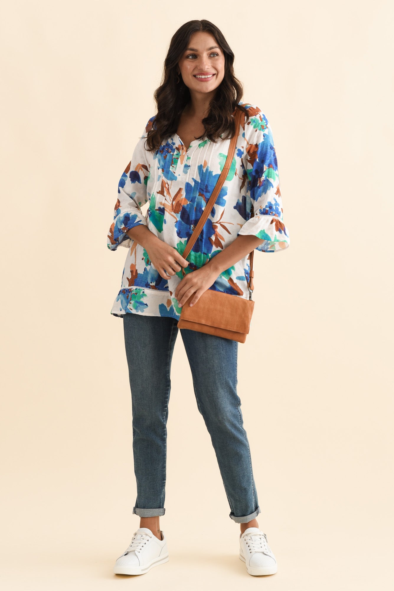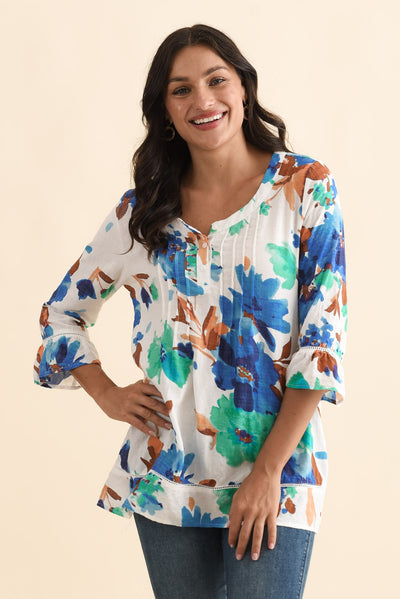 CASSIDY BLUE FLOWER COTTON SLEEVED TOP