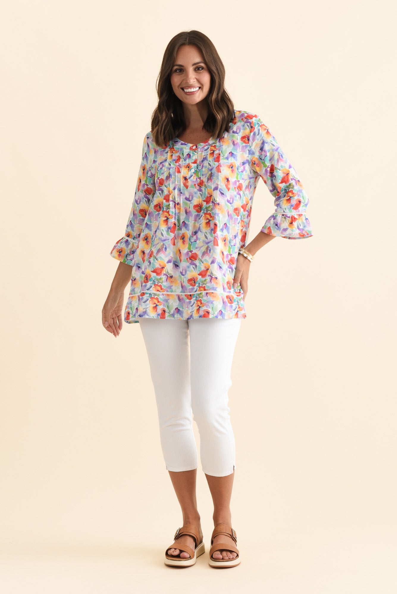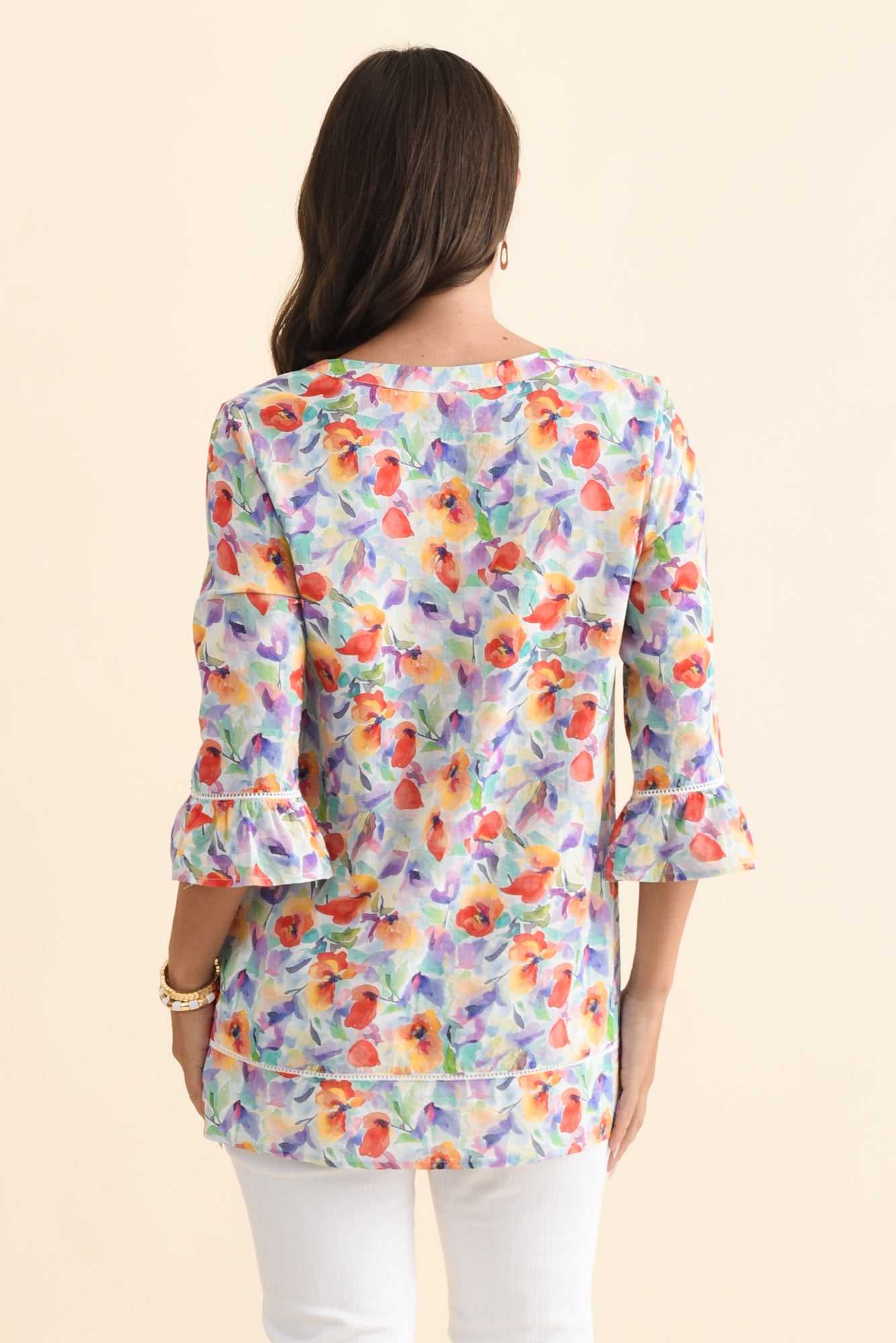 - 3/4-length straight sleeves are finished with gentle frilled cuffs