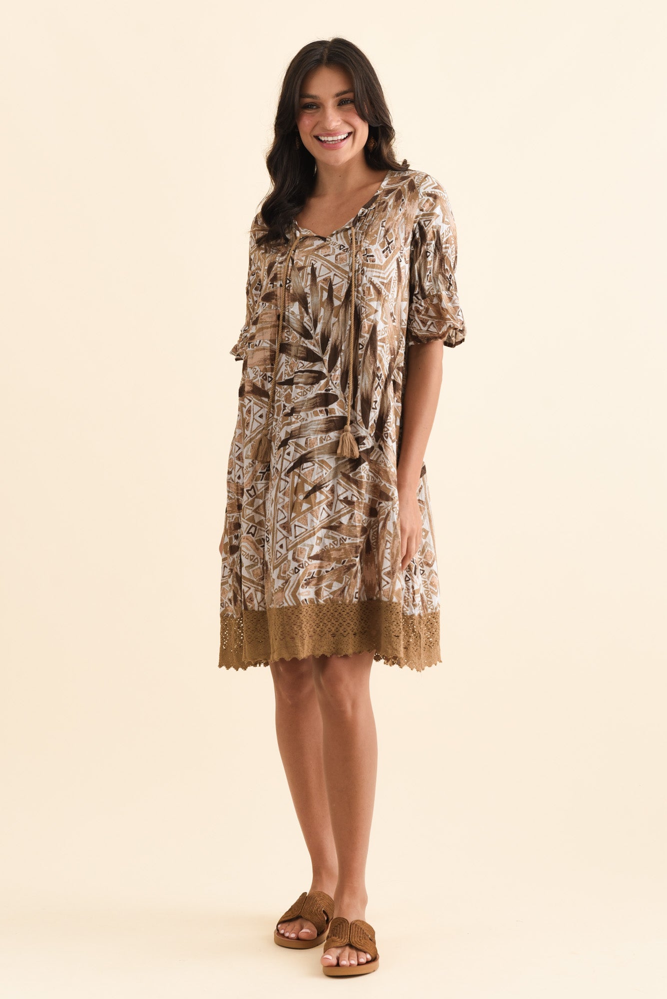 CAYMAN BROWN AZTEC LEAF COTTON TUNIC DRESS