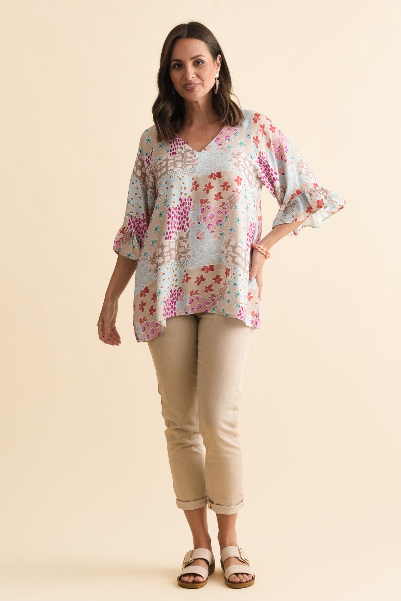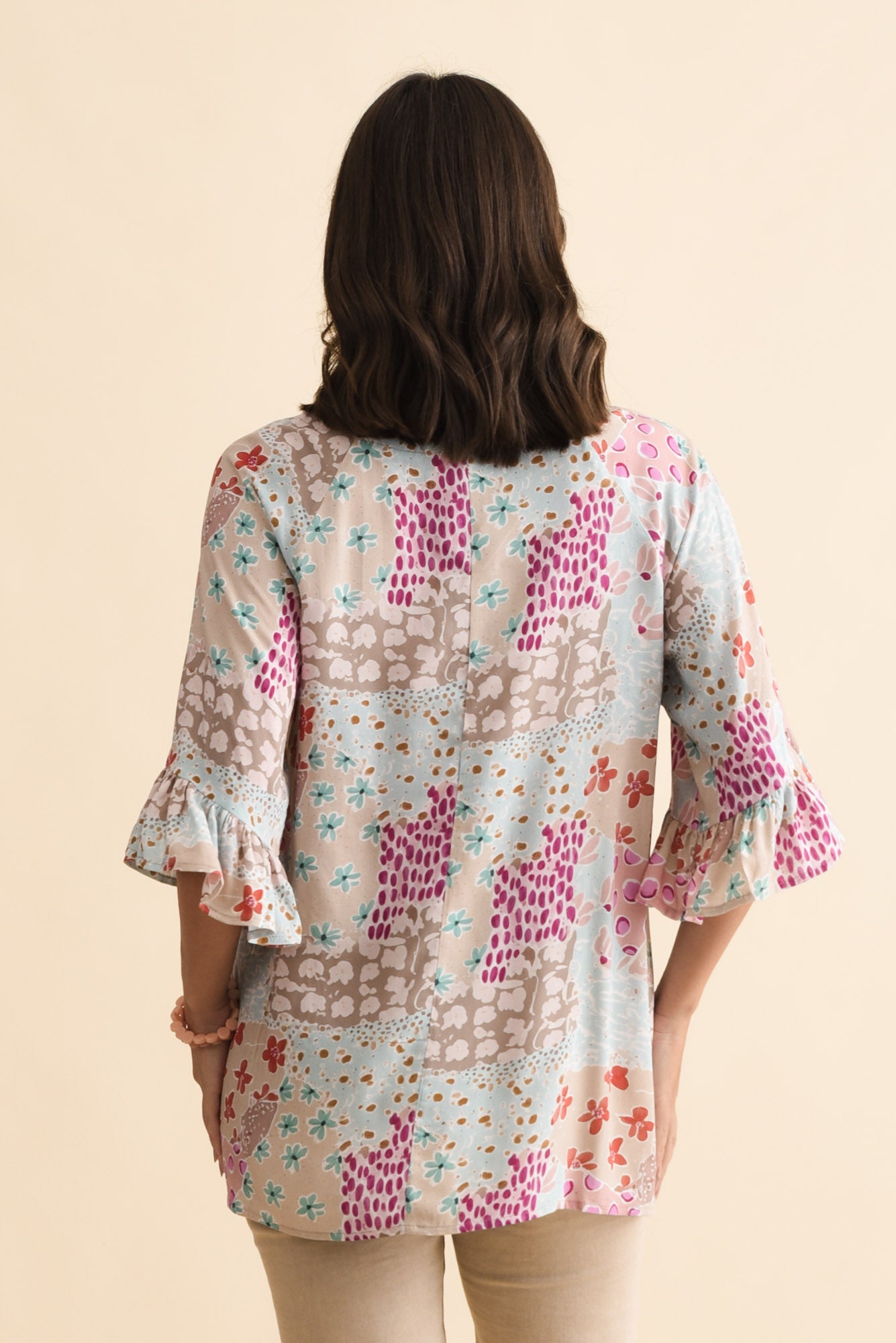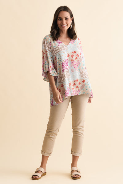 Diona Blue Mosaic Frill Sleeve Top