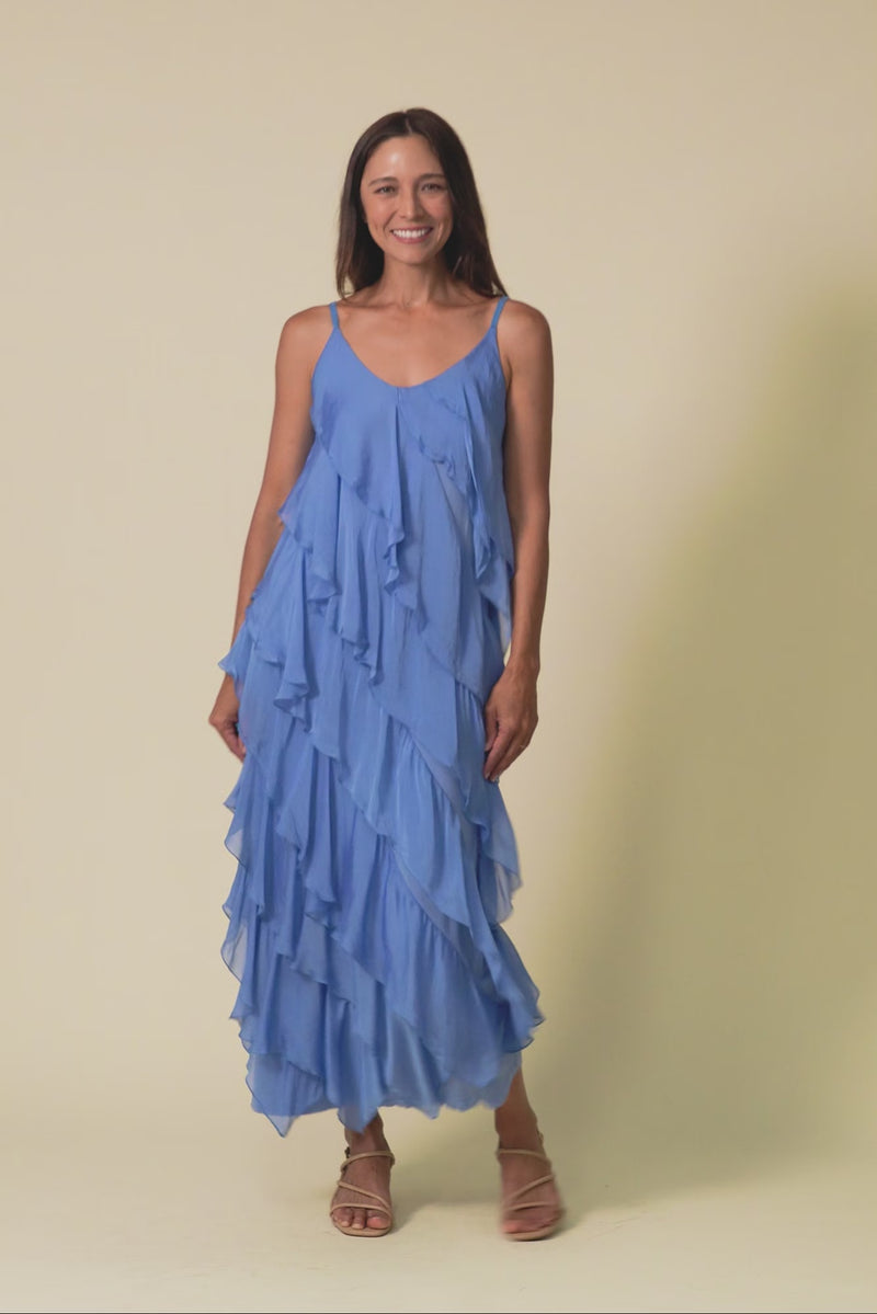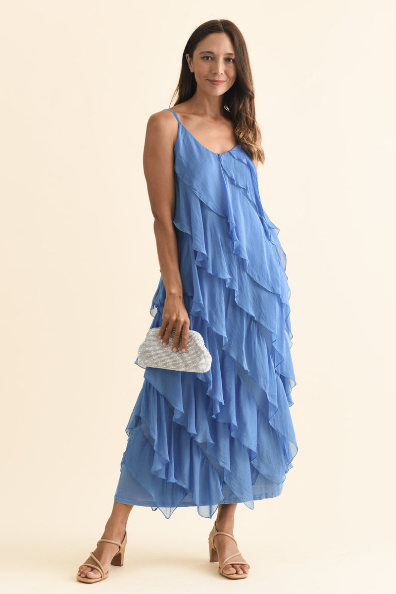 Dominica Blue Silk Ruffle Dress