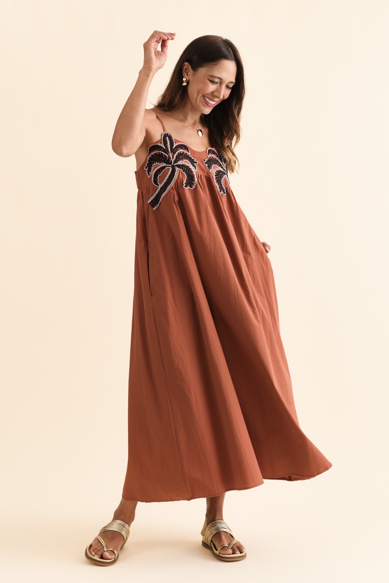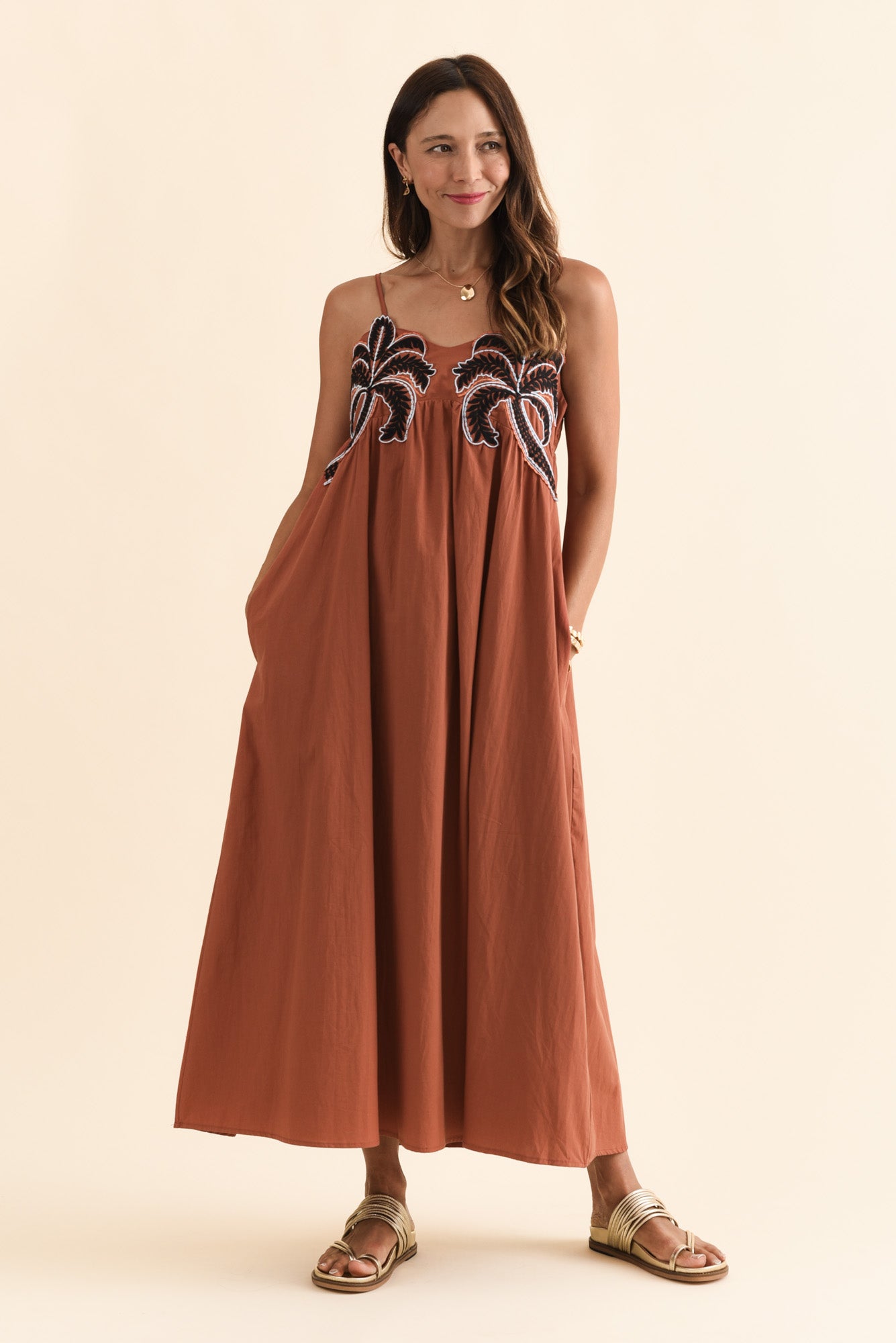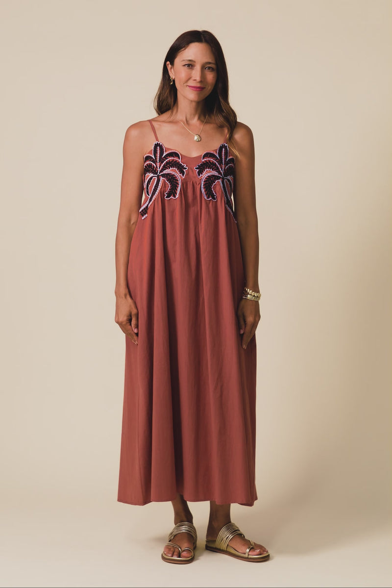 Delicate adjustable straps highlight the neckline, accented by two striking embroidered palm trees that bring this dress to life