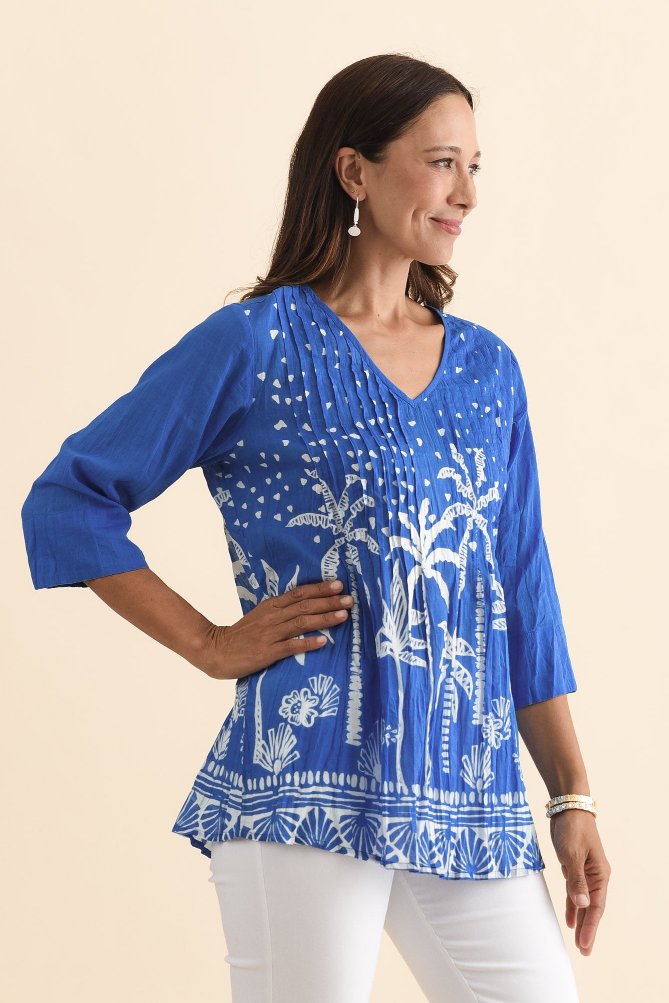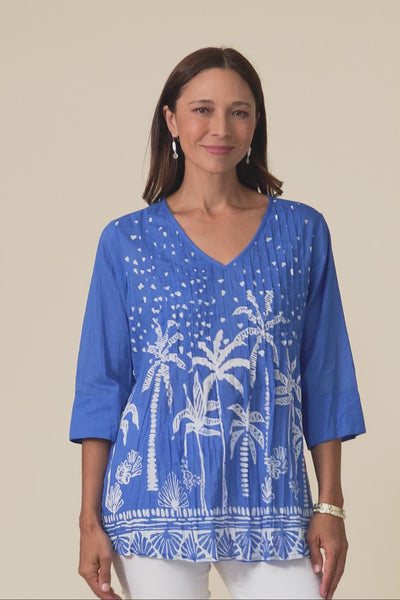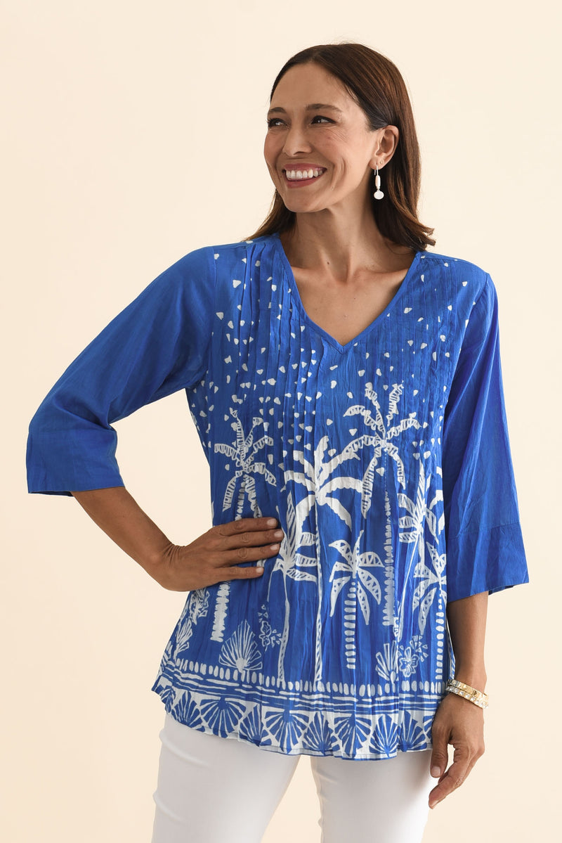 Fia Cobalt Palm Sleeved Crinkle Cotton Top