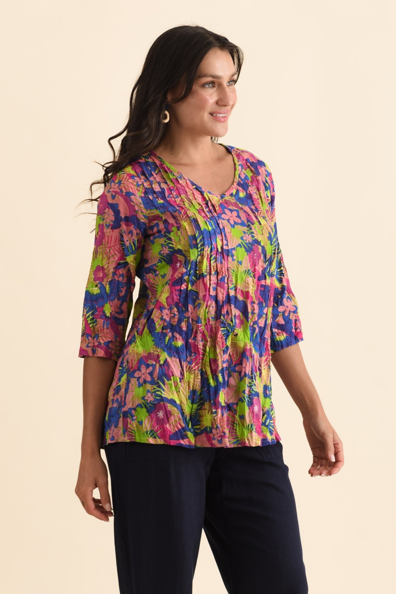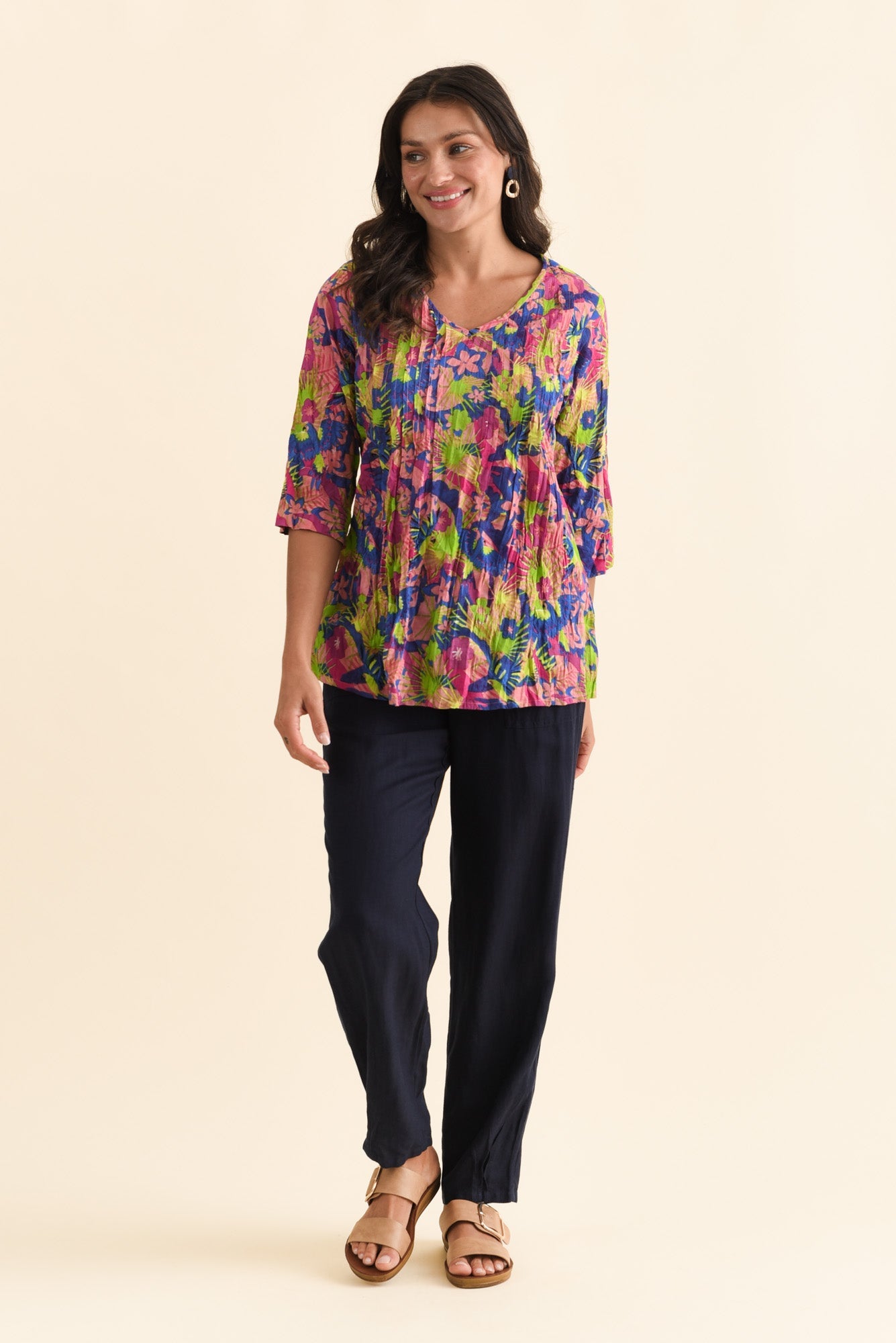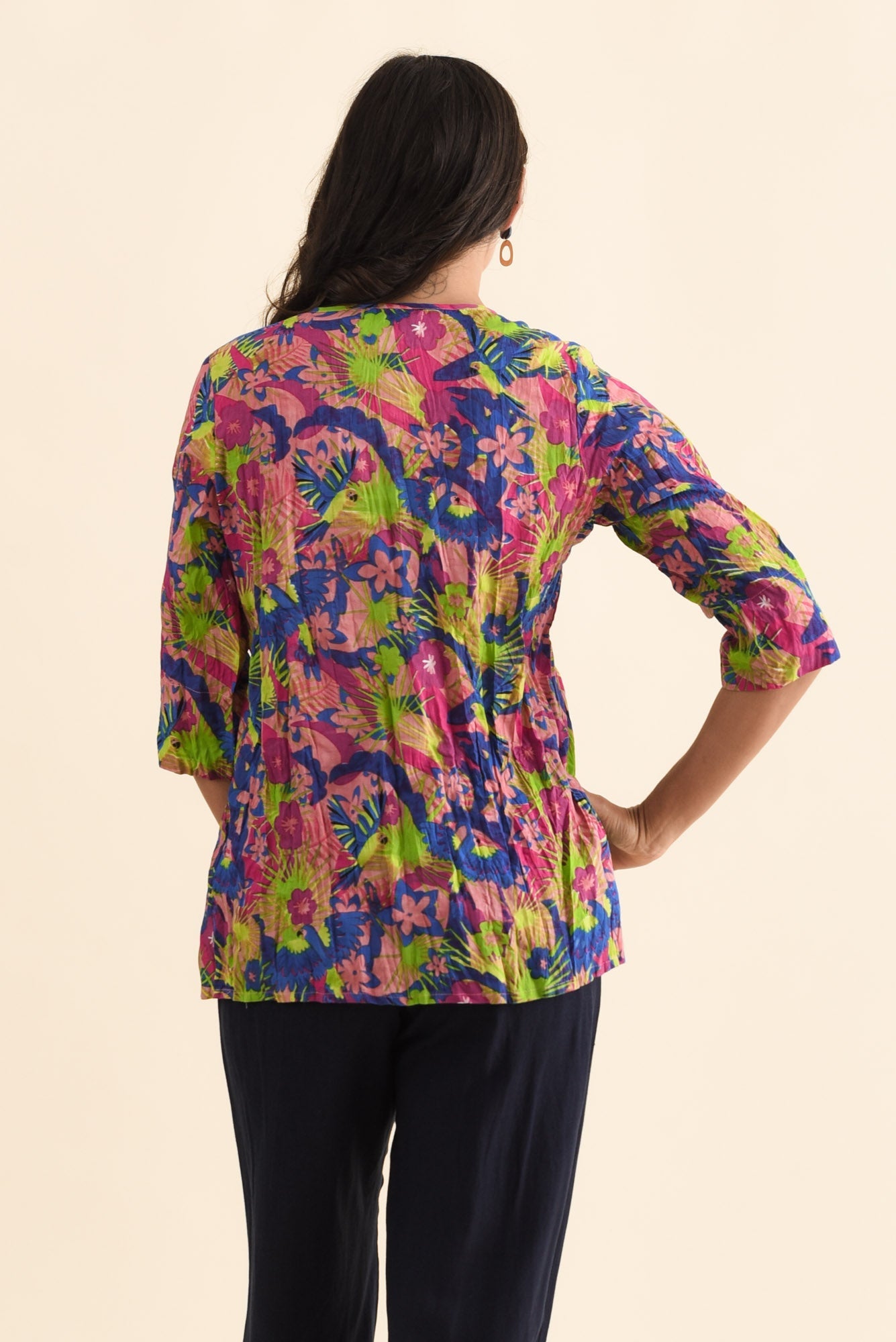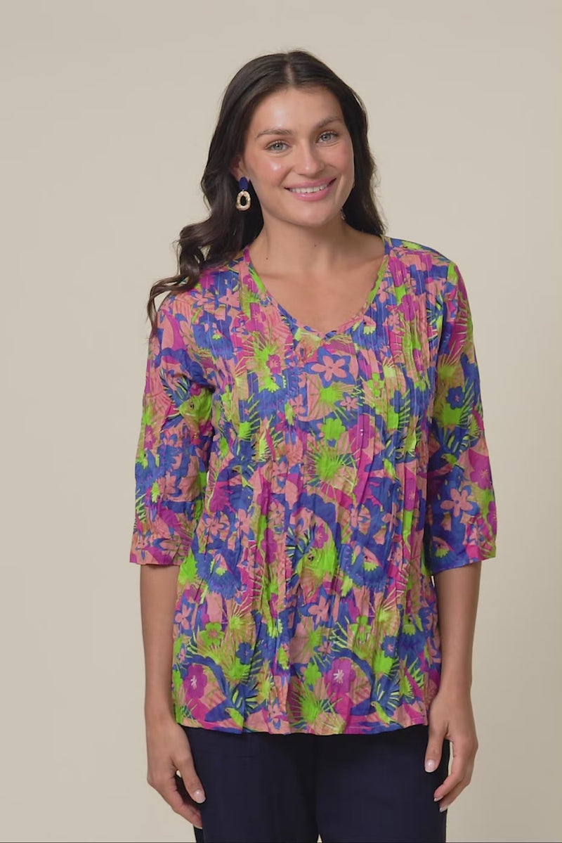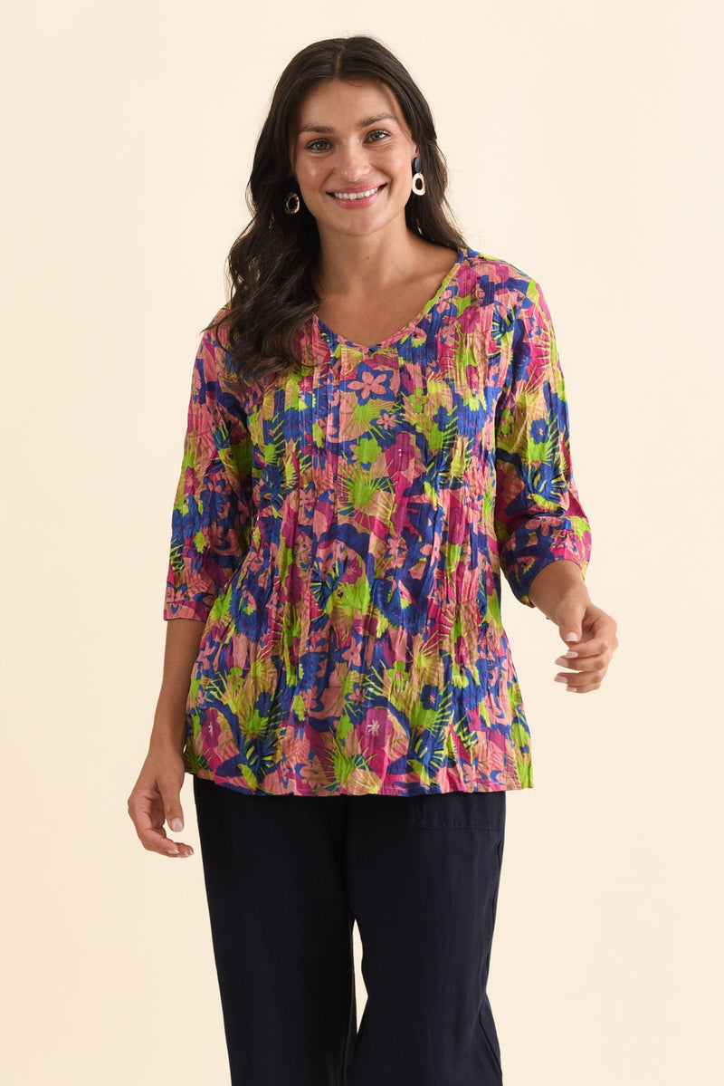 Fia Navy Botanical Sleeved Crinkle Cotton Top
