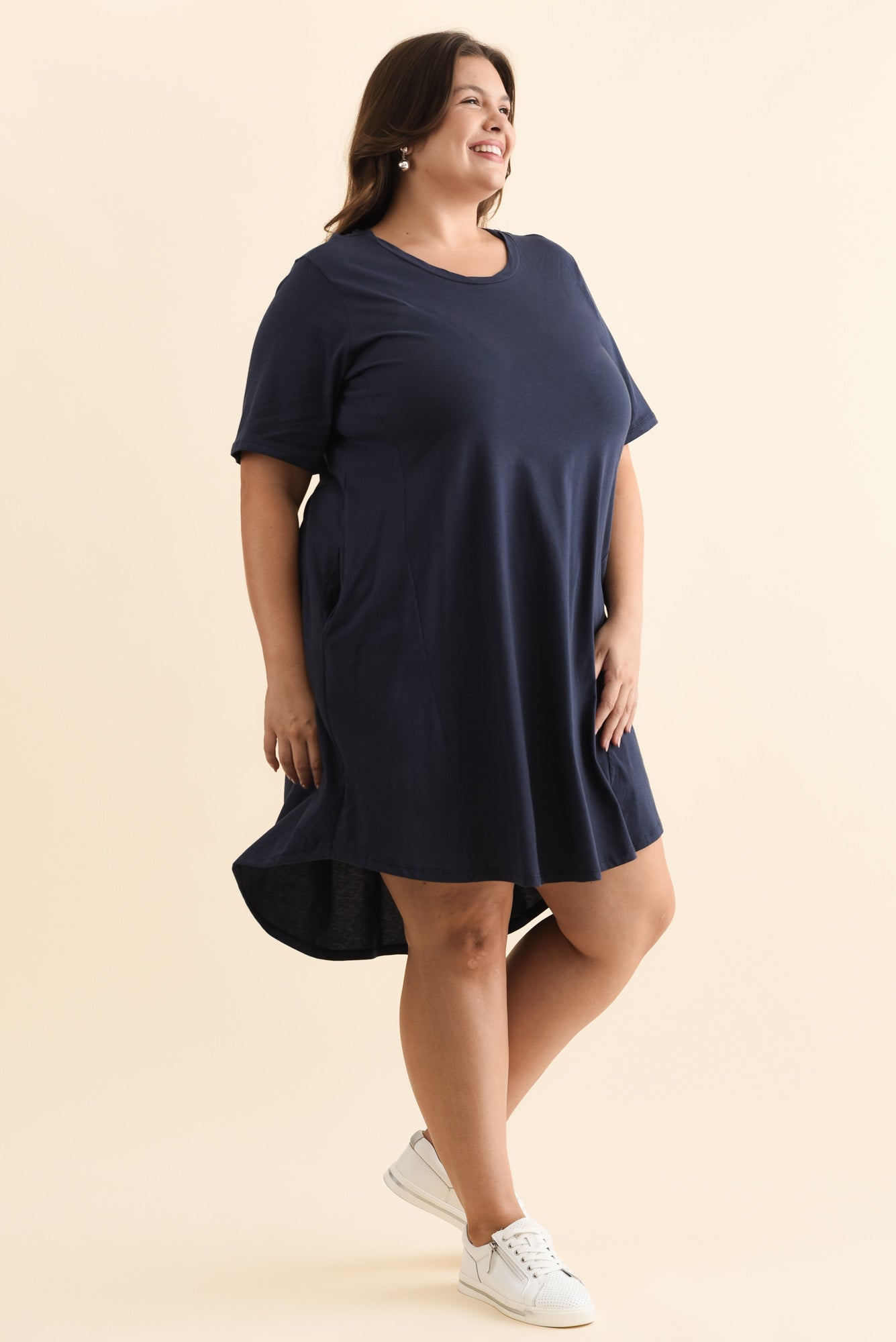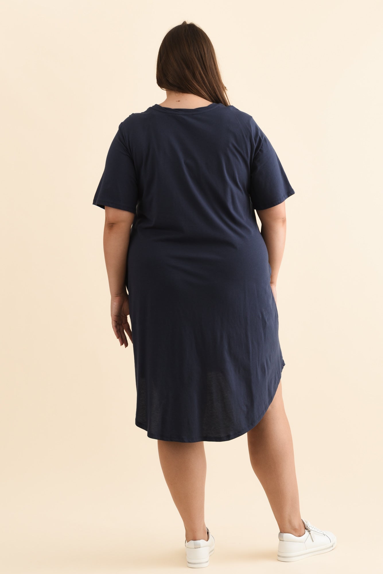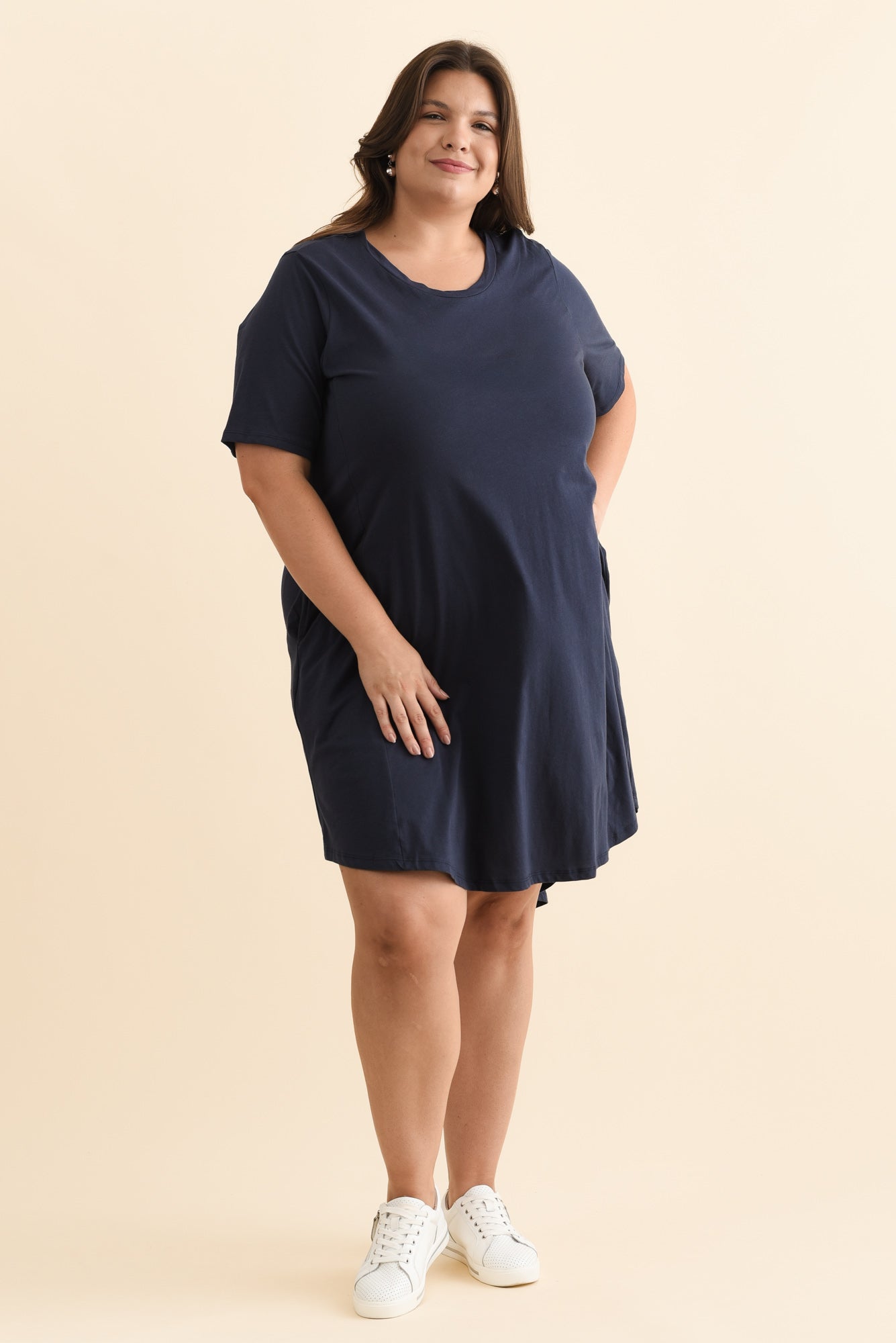 Keep things breezy and casual with this timeless navy cotton tee dress, offering buttery soft comfort and a gentle stretch