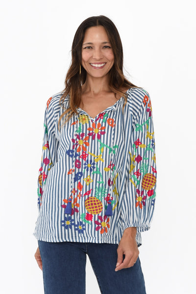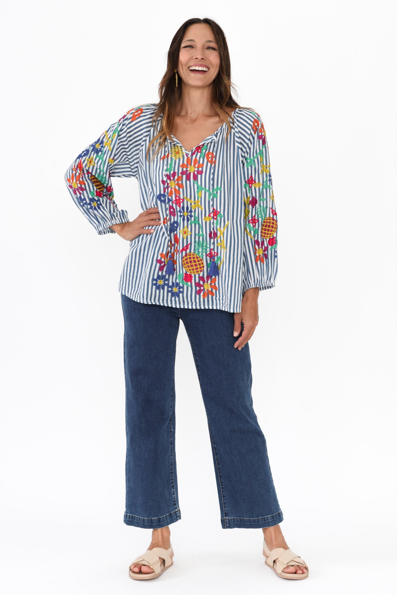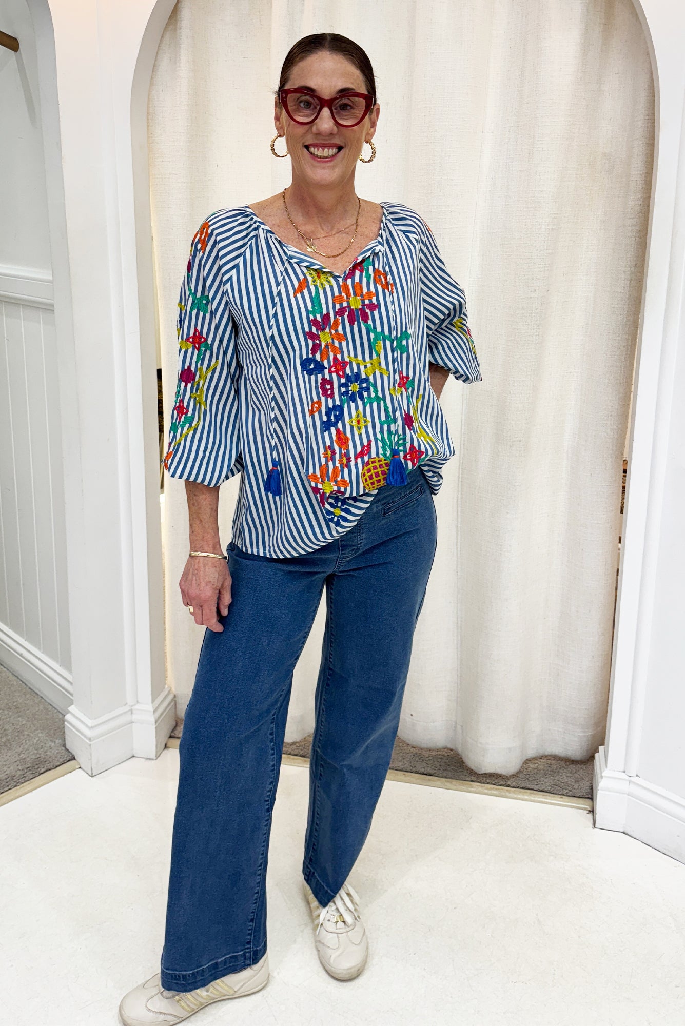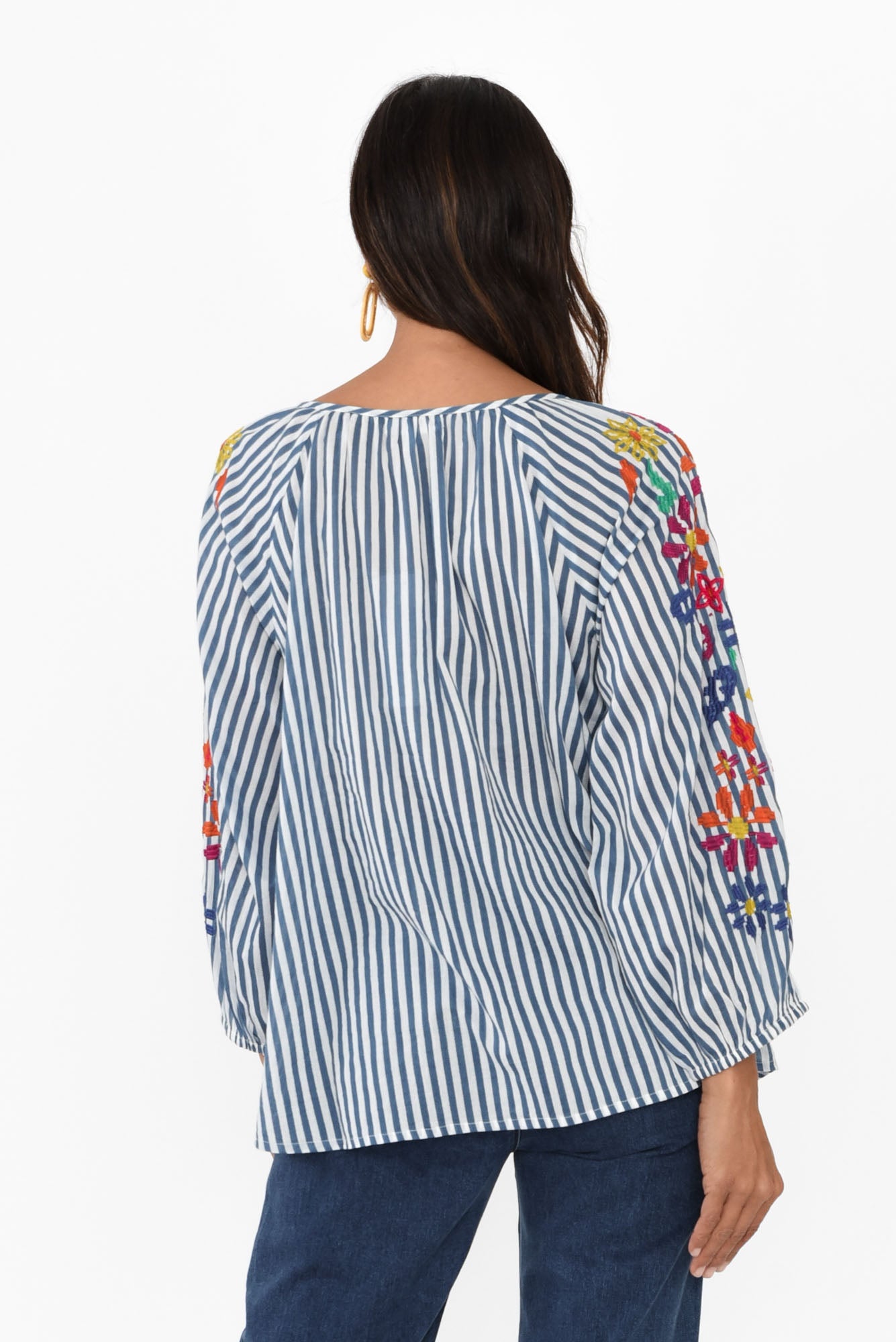 HONORA BLUE STRIPE EMBROIDERED COTTON TOP
