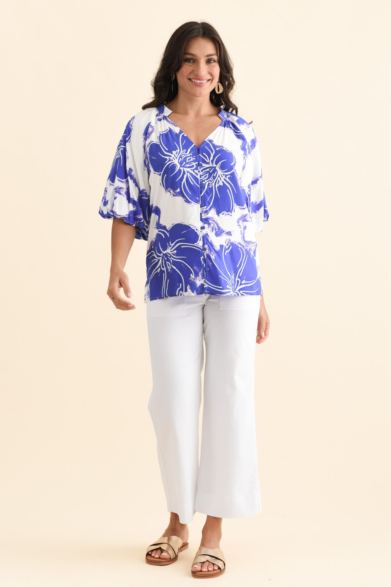 Jewel Cobalt Flower Puff Sleeve Blouse