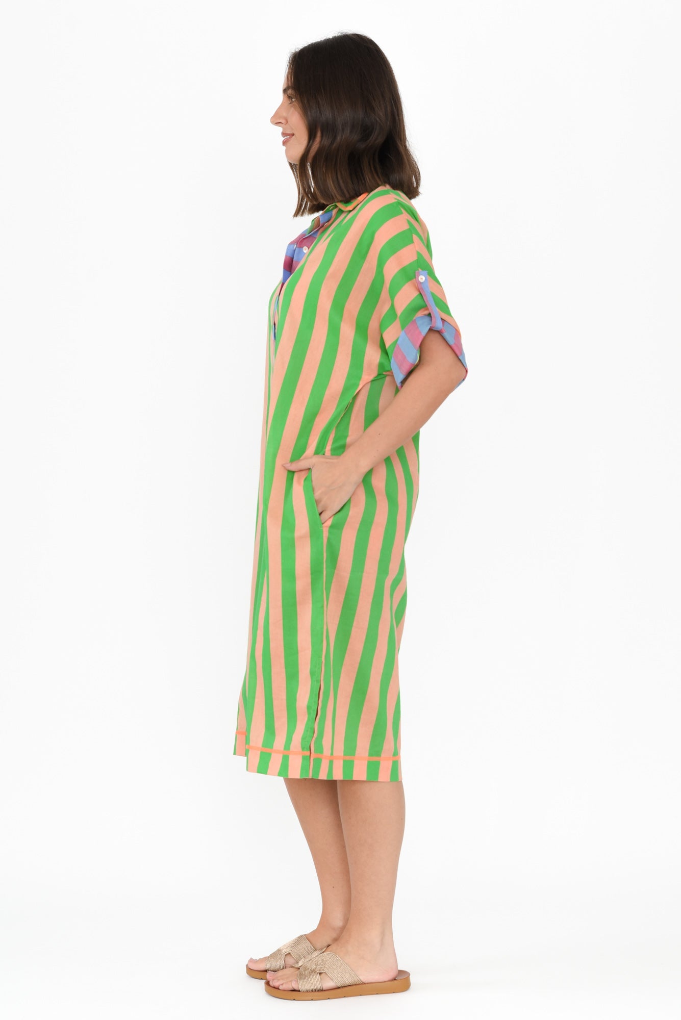 Kalinda Green Stripe Cotton Shirt Dress