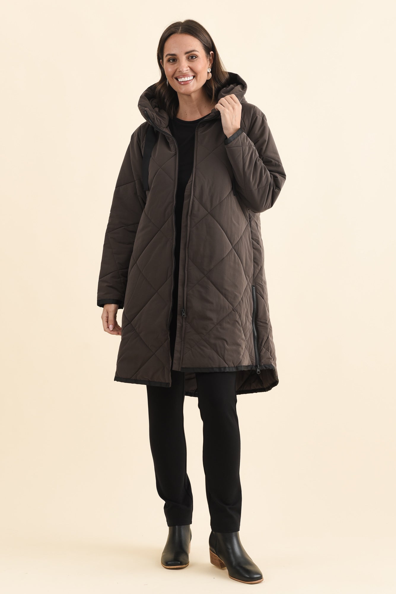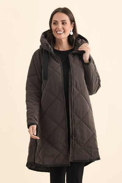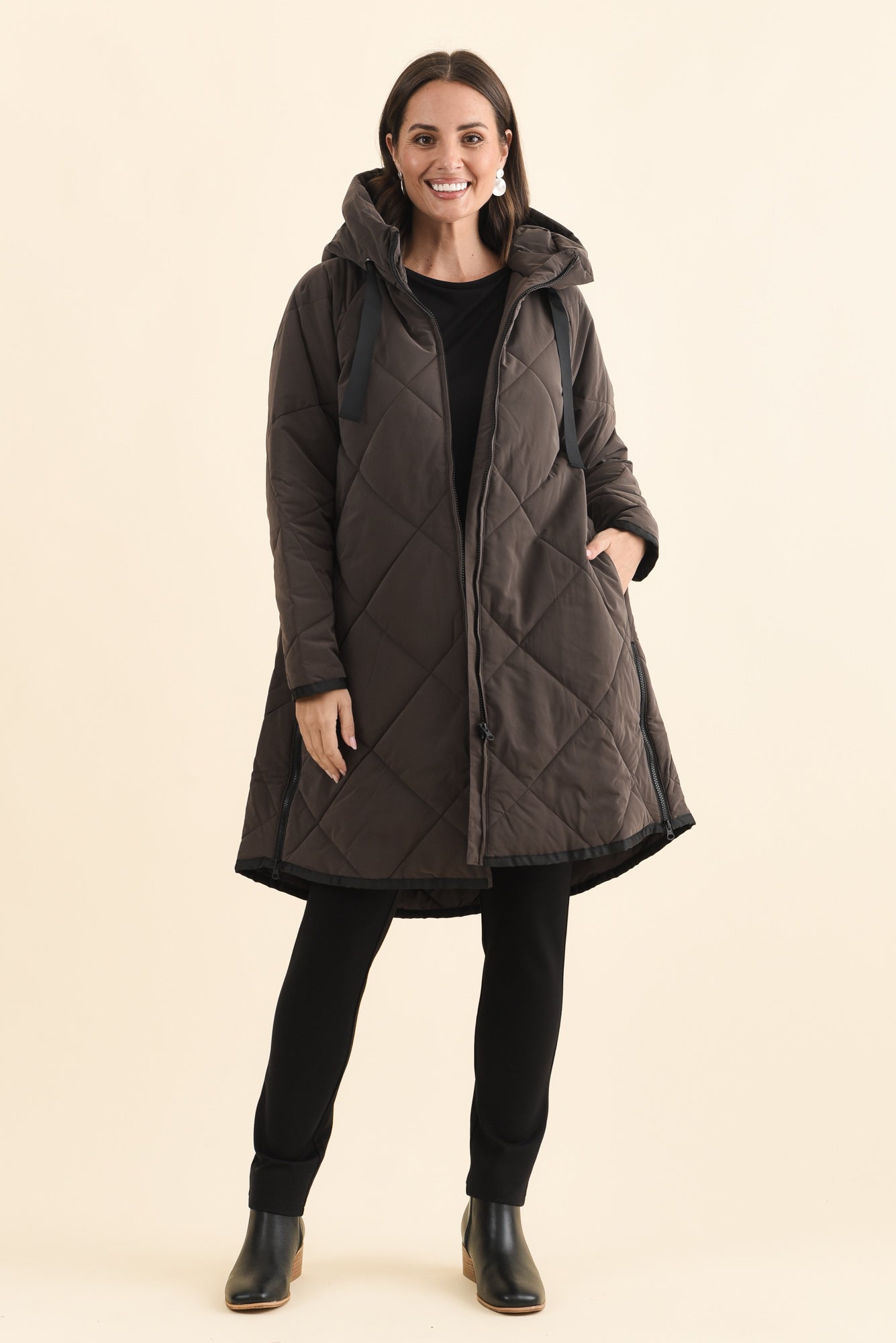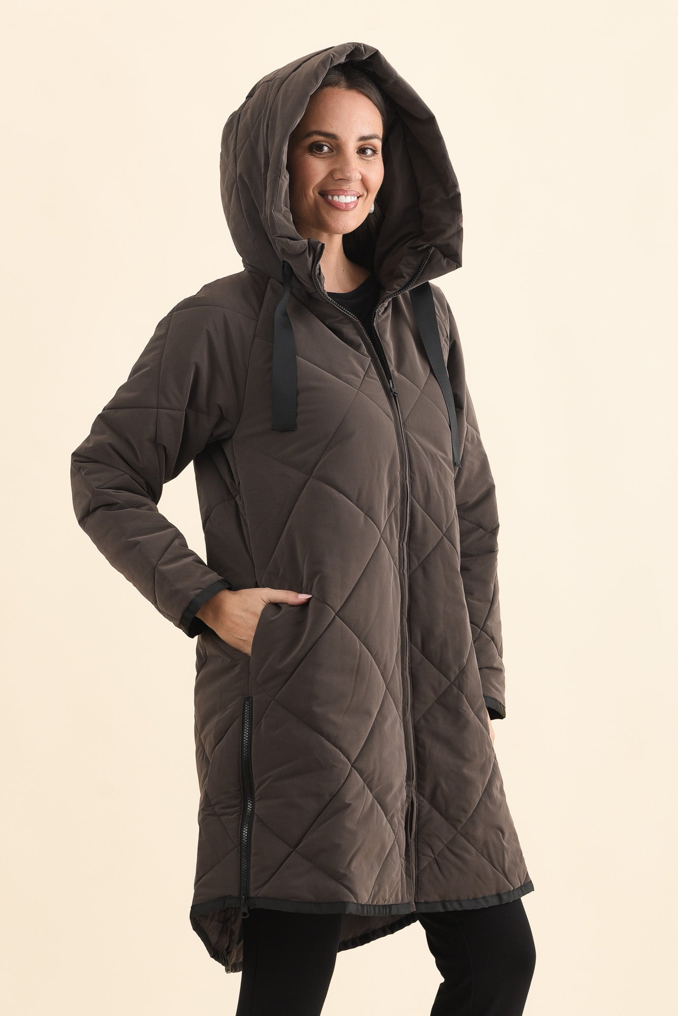 KOAMI CHOCOLATE QUILTED HOODED COAT