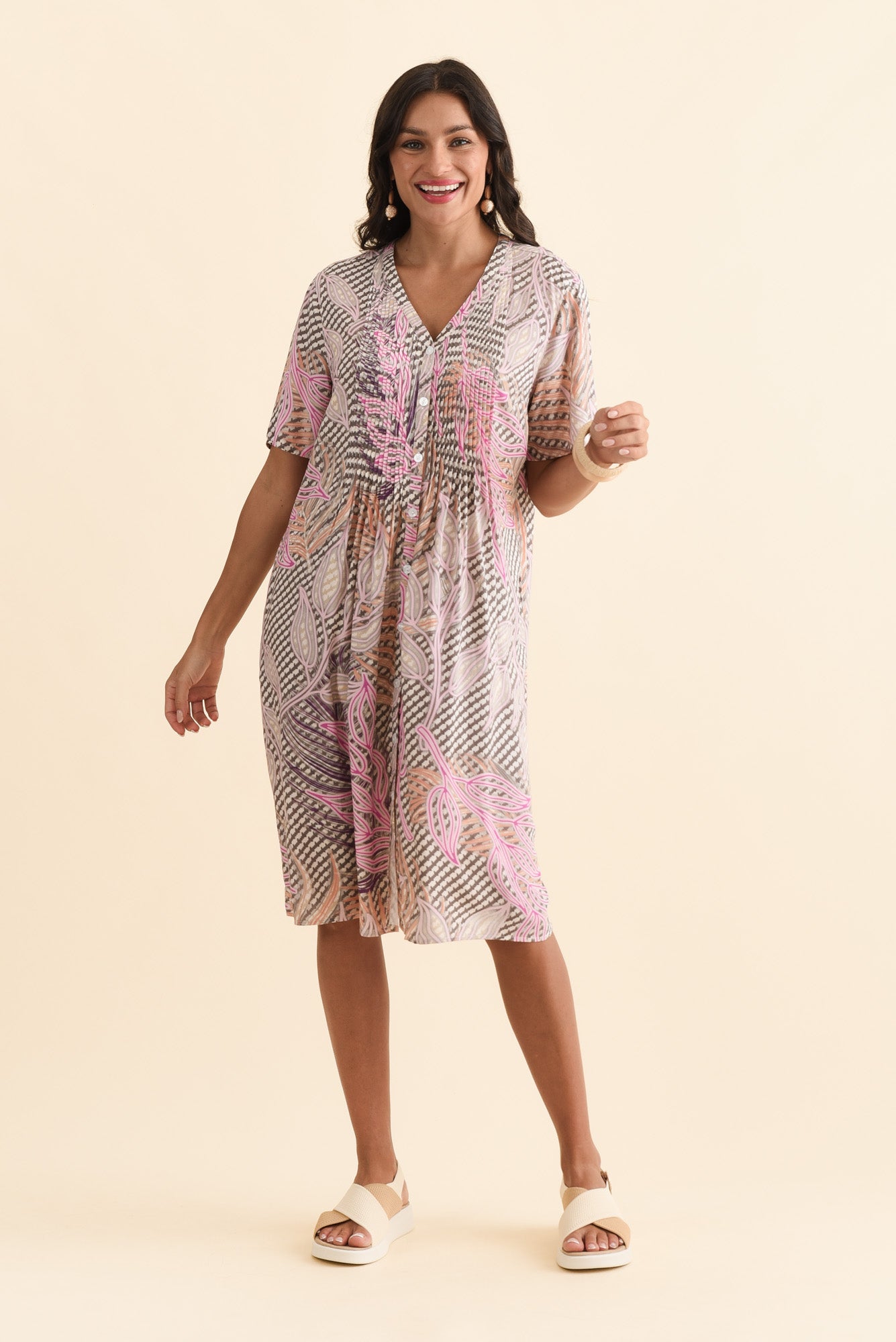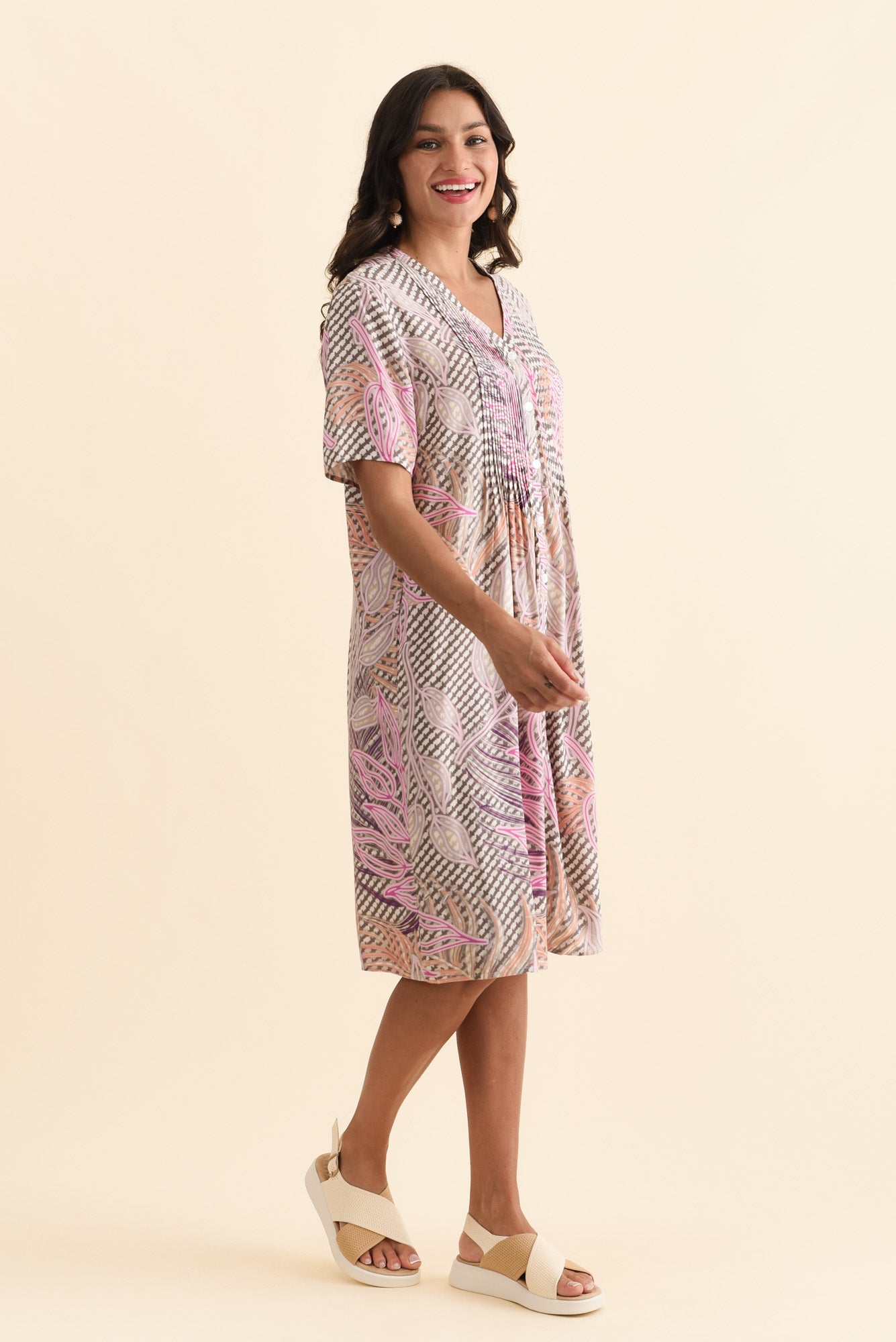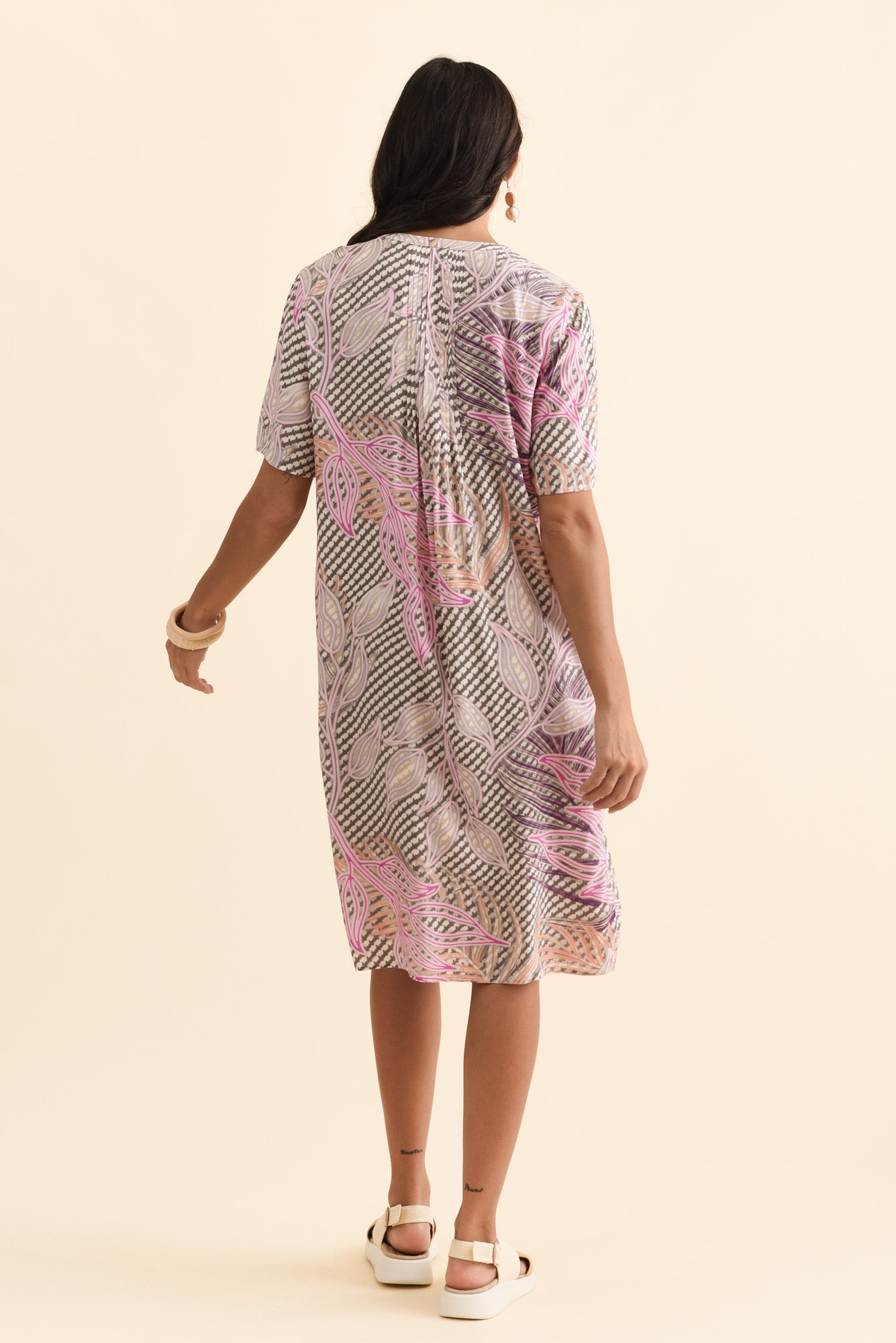 An abstract leaf print of pink, purple and orange hues on a cream and grey base