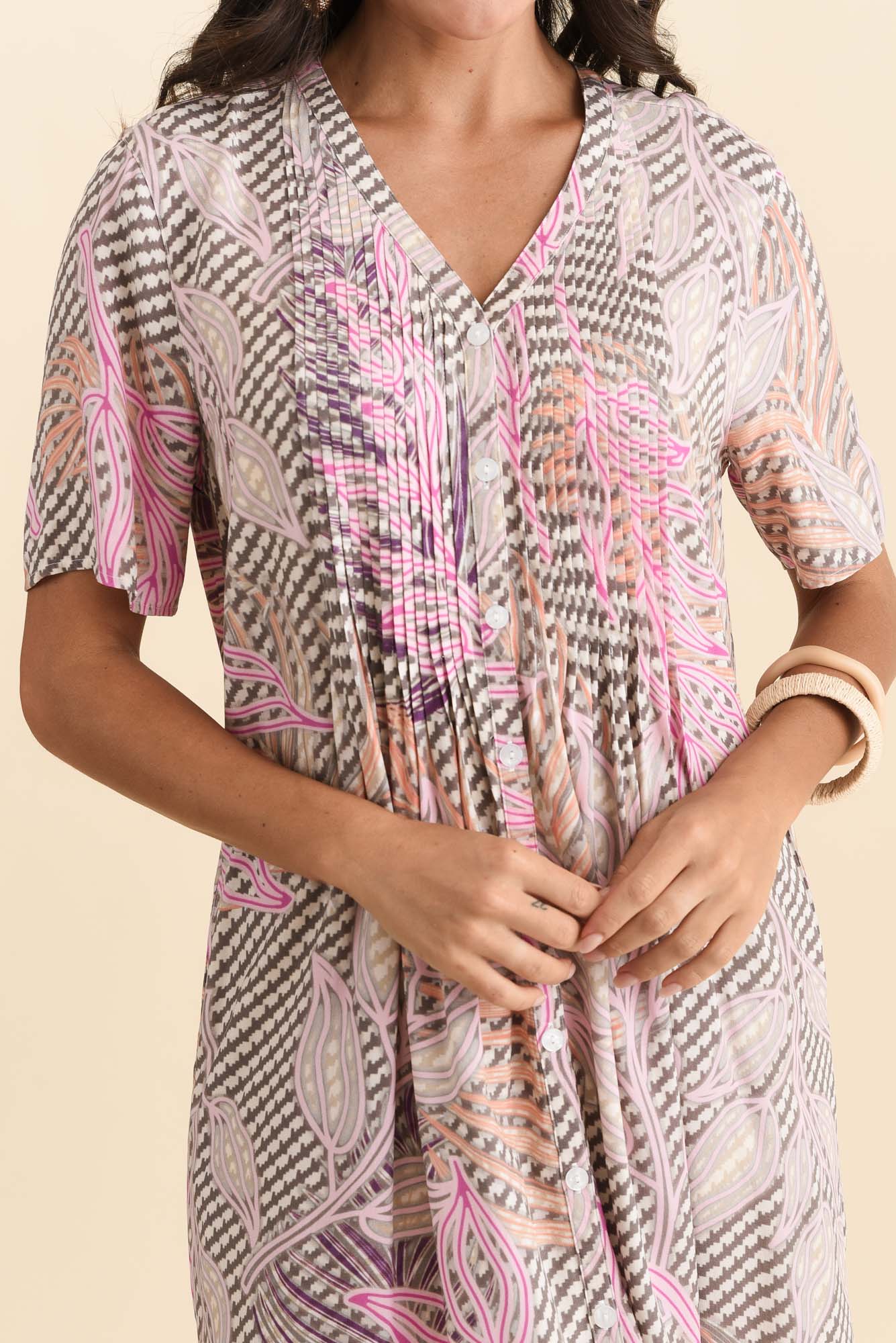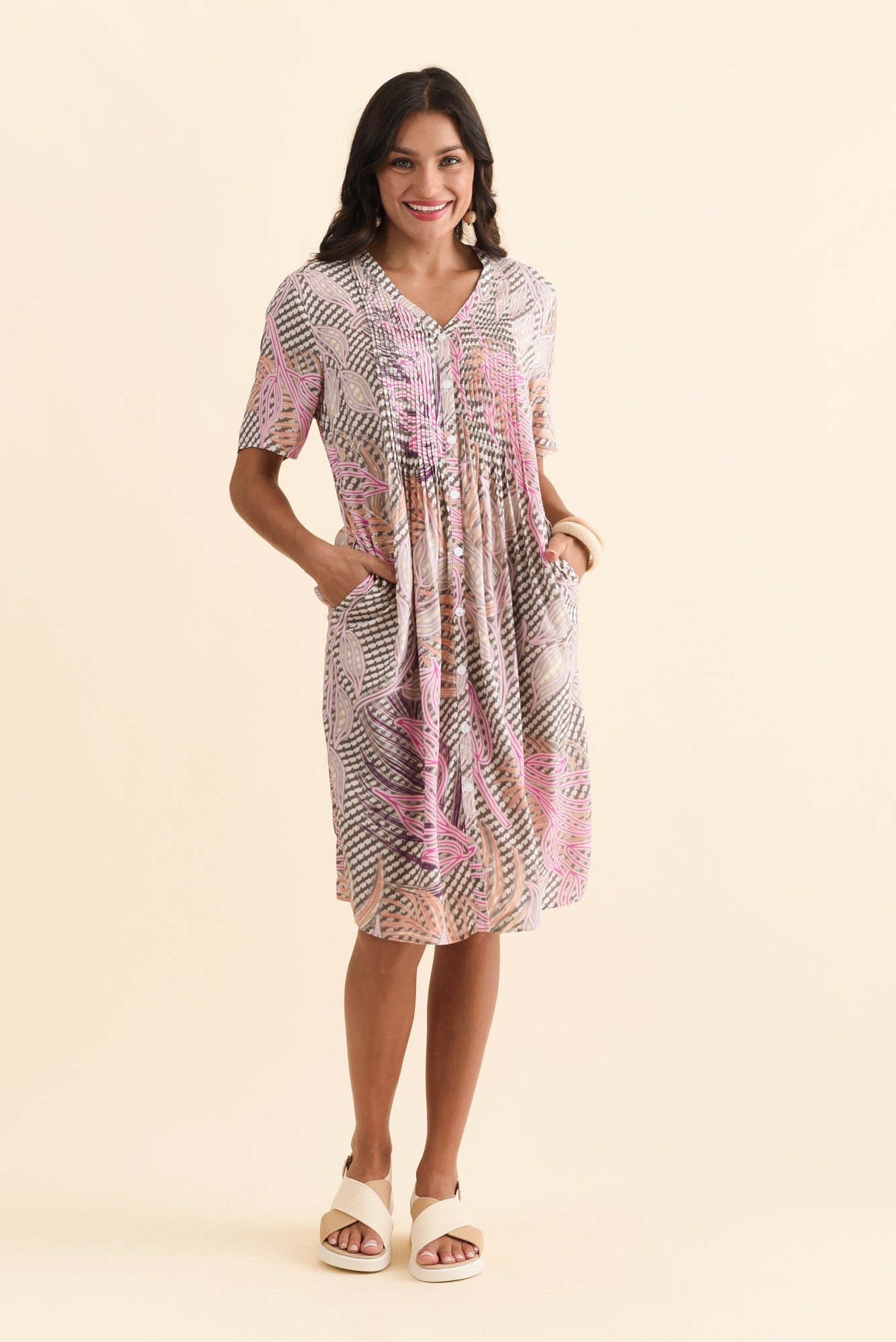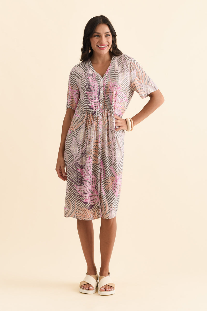 An abstract leaf print of pink, purple and orange hues on a cream and grey base