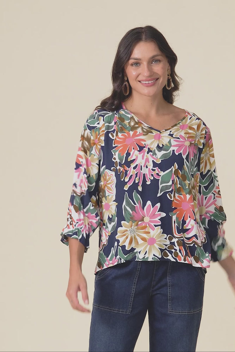 Lourdes Navy Floral Frill Sleeve Top