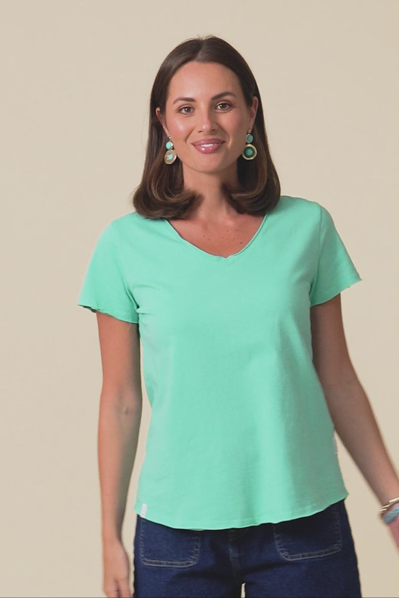 Features a V-neckline and straight cut breezy short sleeves with a rolled hem detail around the neckline and cuffs