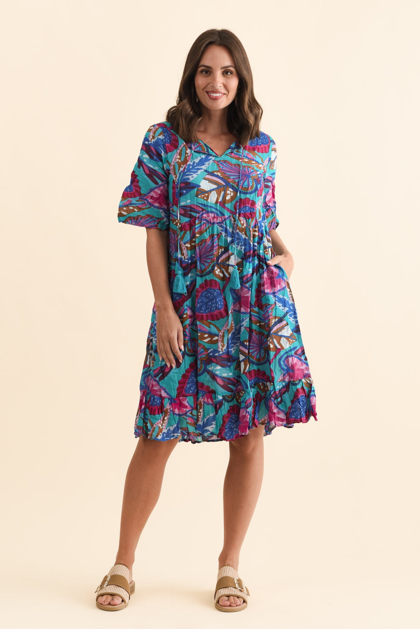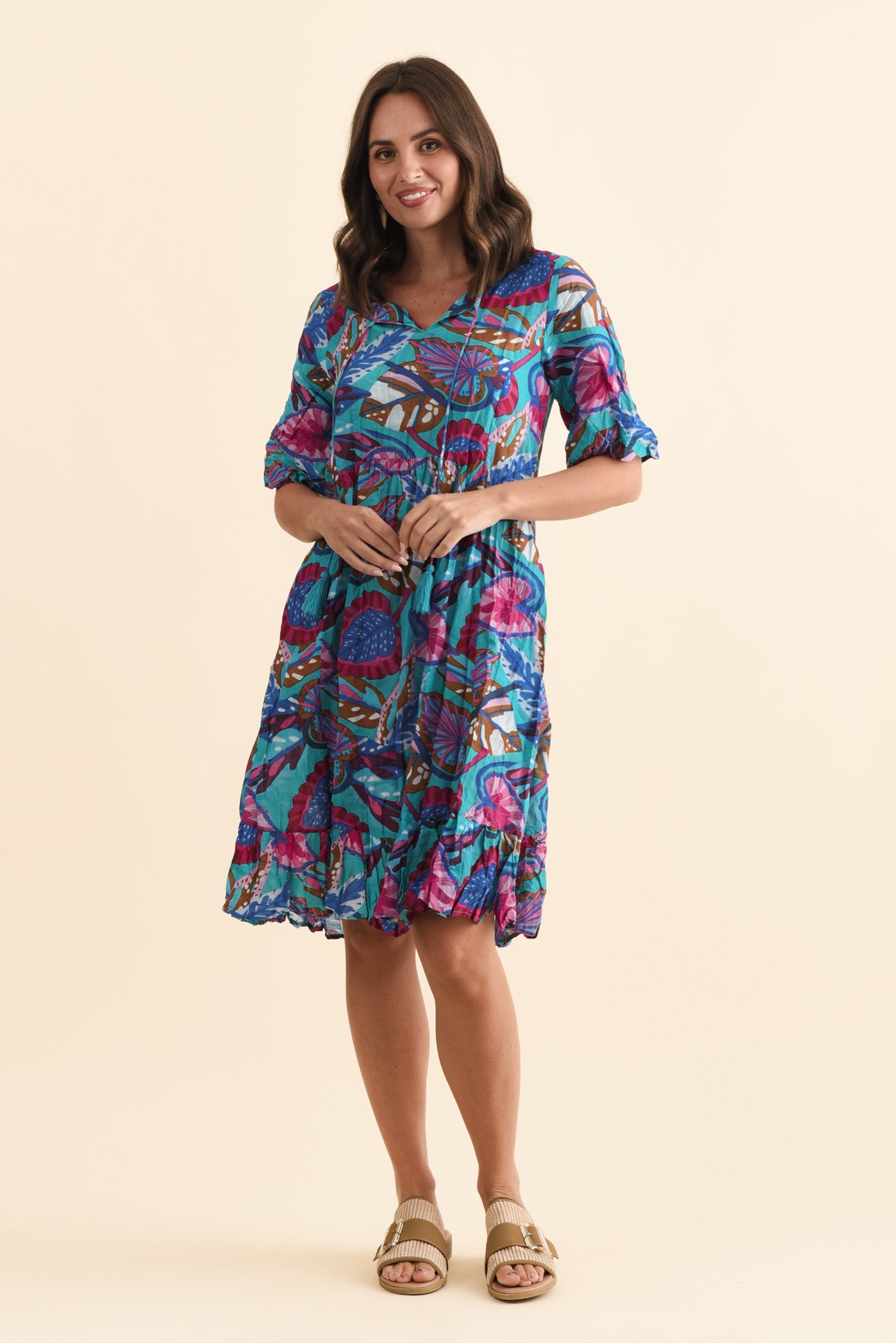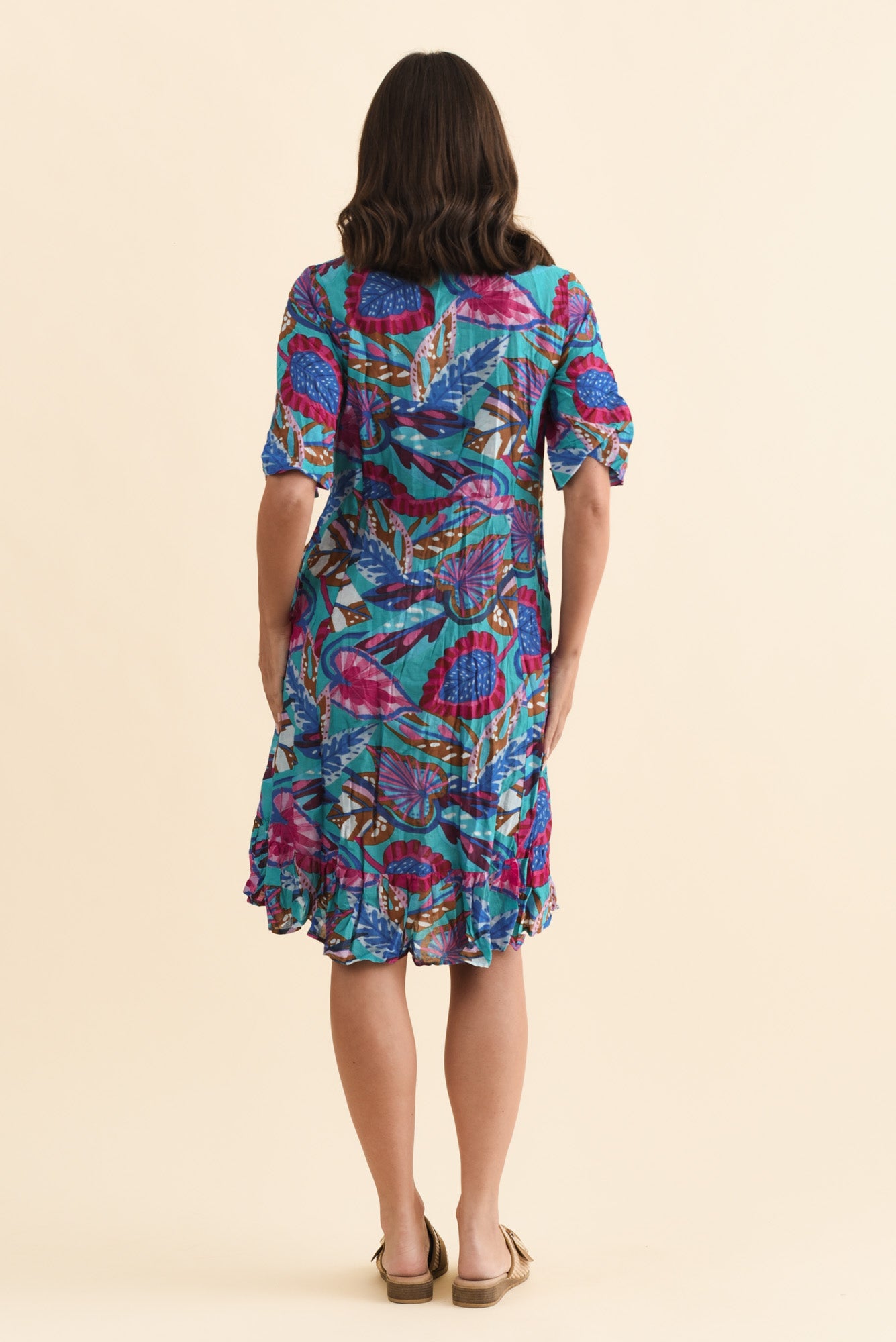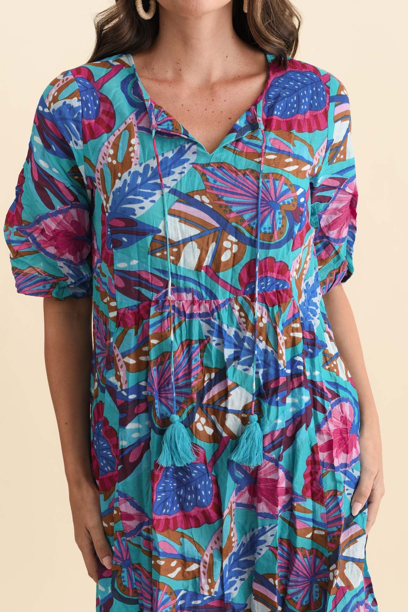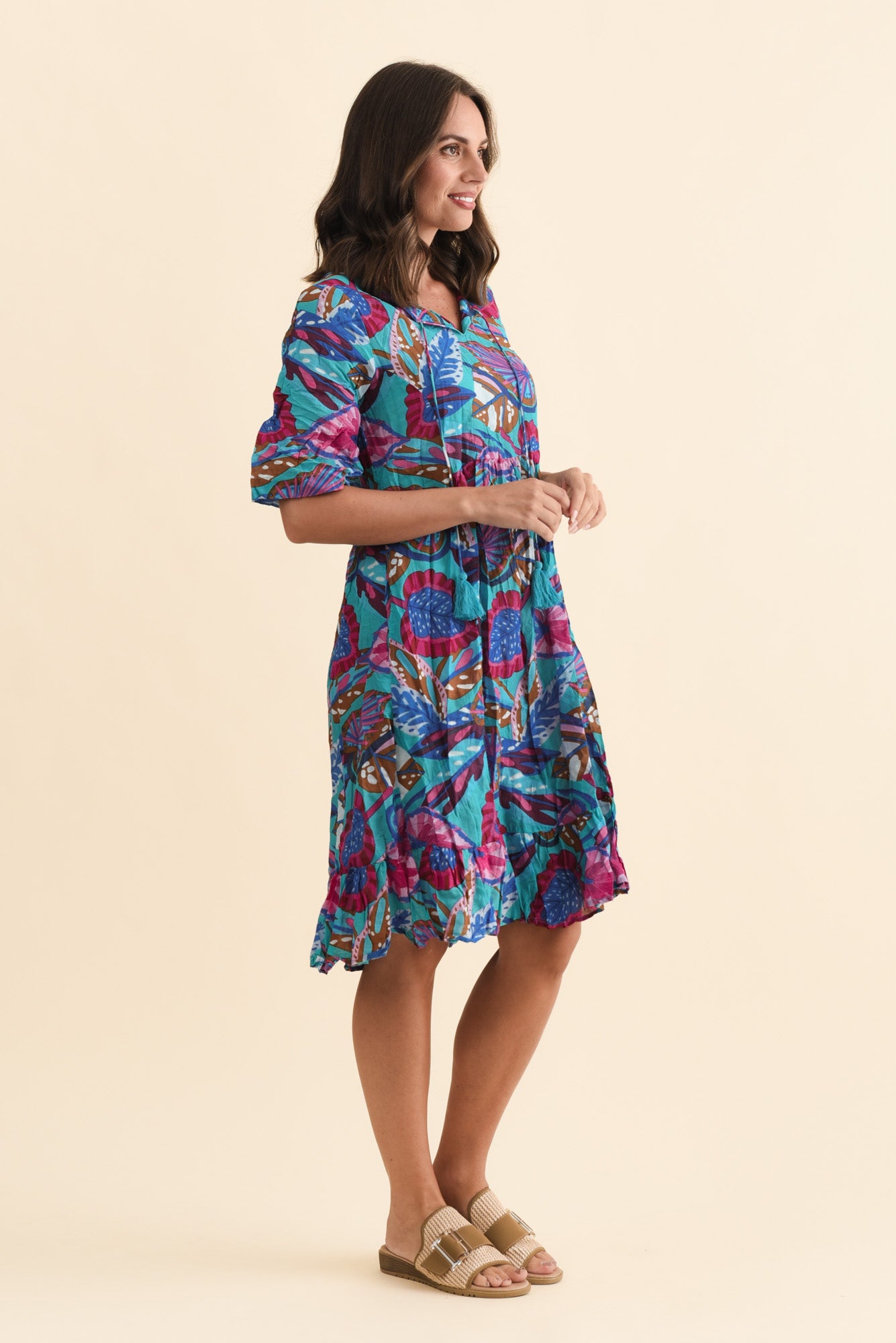 MILA BLUE TROPICAL CRINKLE COTTON DRESS