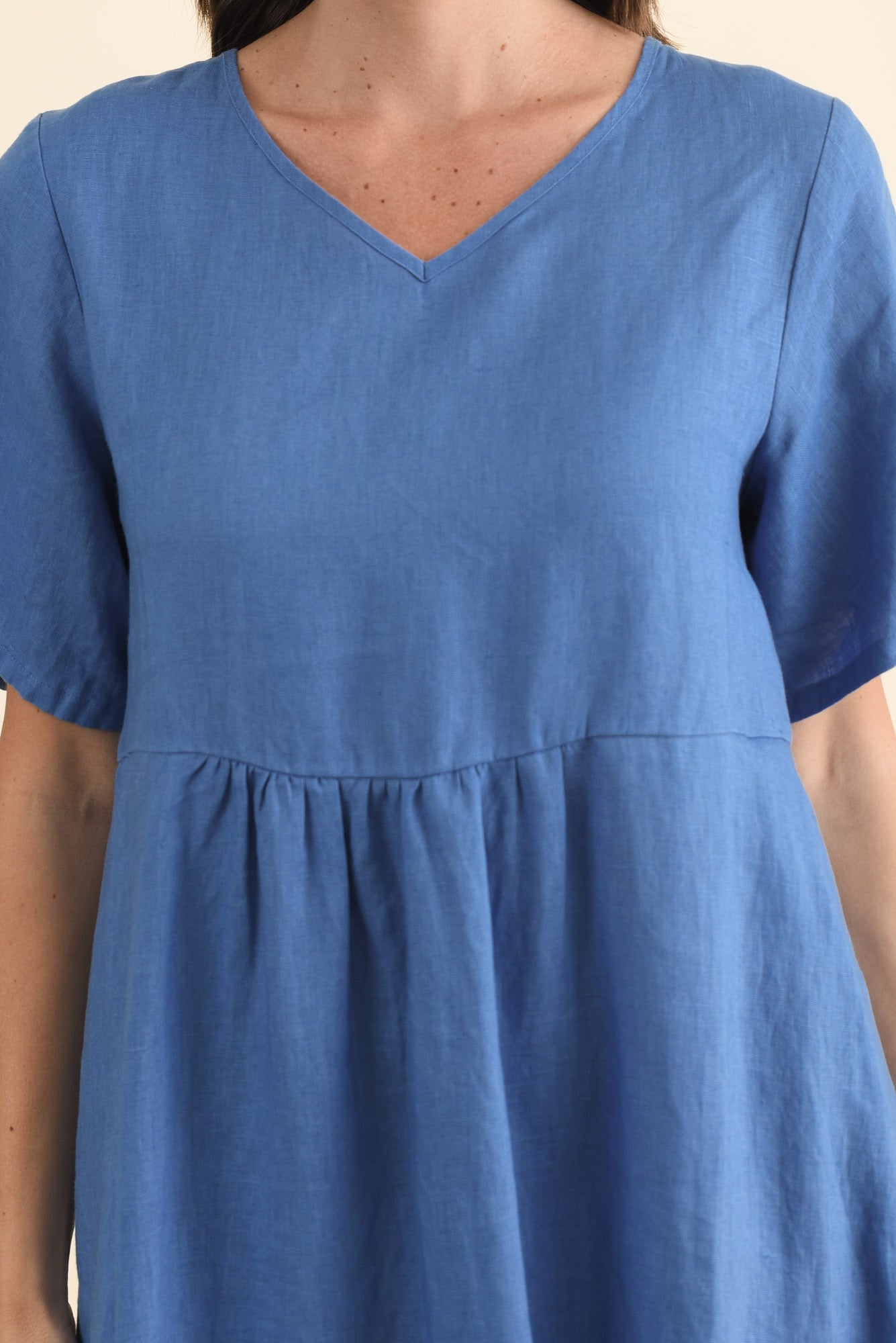 Subtle V-neckline flows into relaxed tee-style sleeves for effortless everyday wear