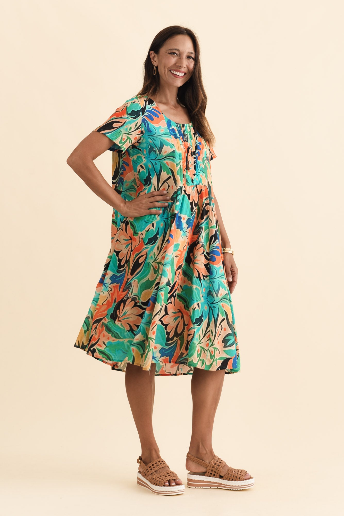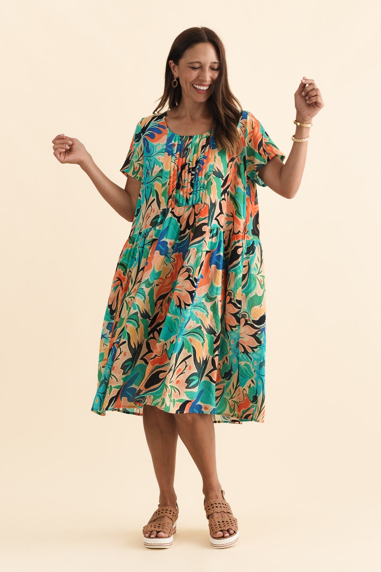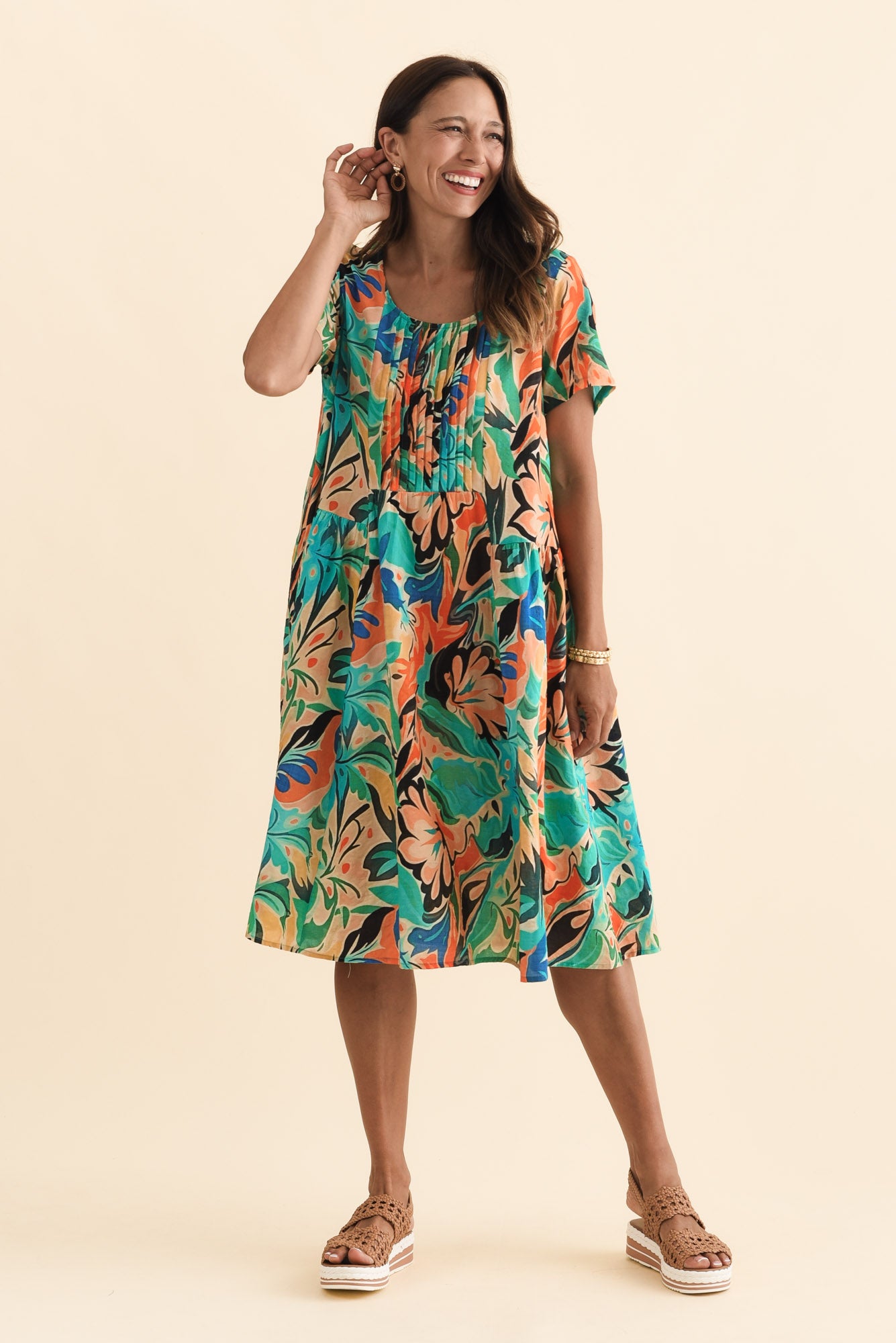A-line swing silhouette with fine vertical pleats through the bodice and gentle gathers at the waist seam, adding shape and soft dimension without cling