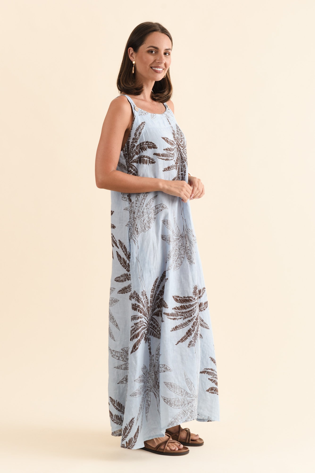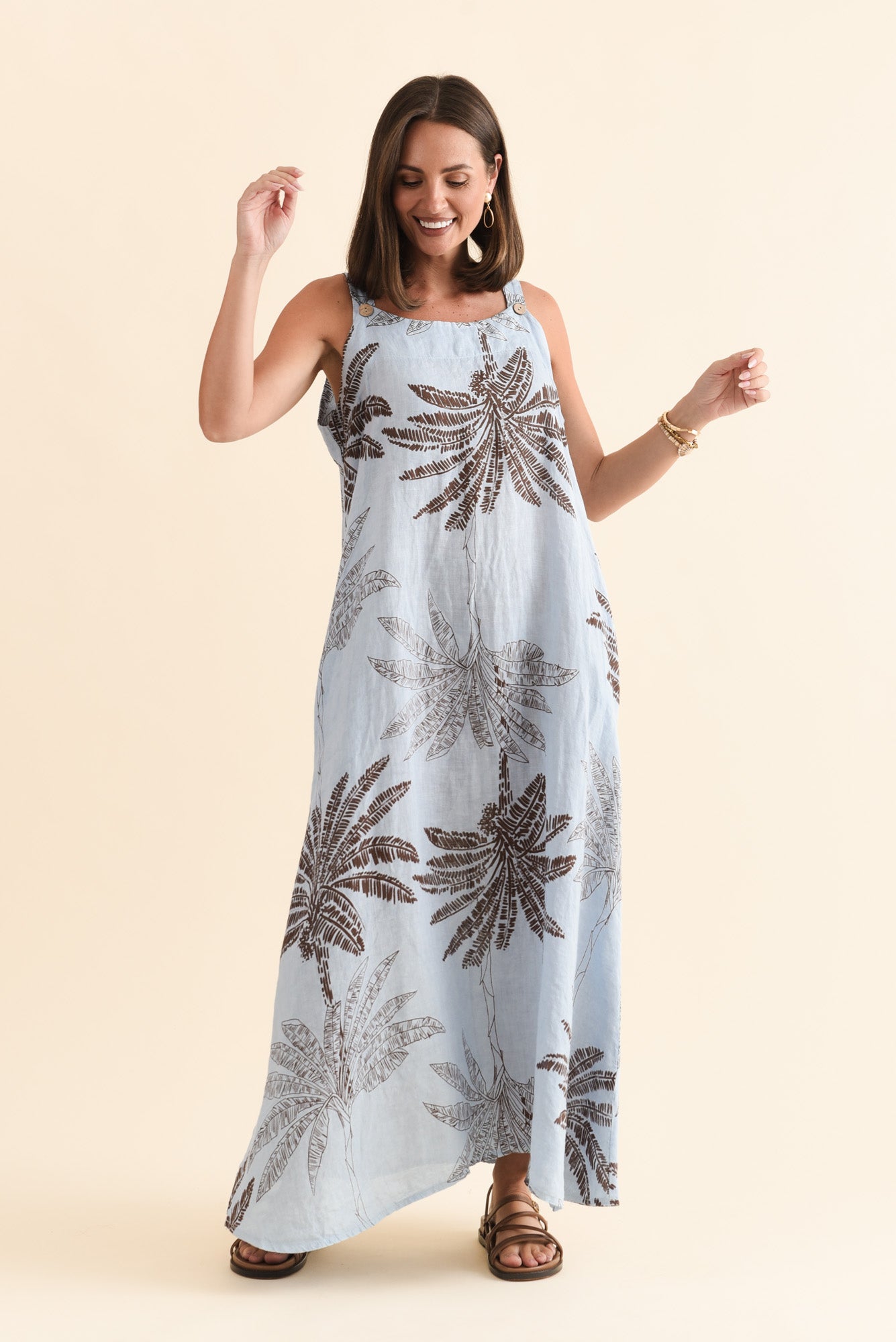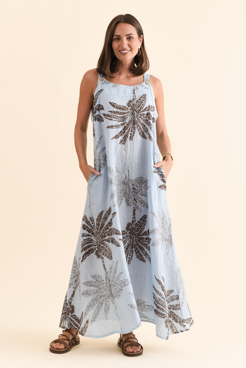 NADIA BLUE PALM LINEN MAXI DRESS