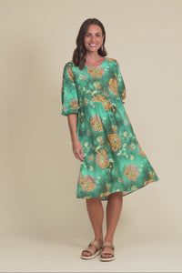 Nicolette Teal Flower Cotton Blend Sleeved Dress