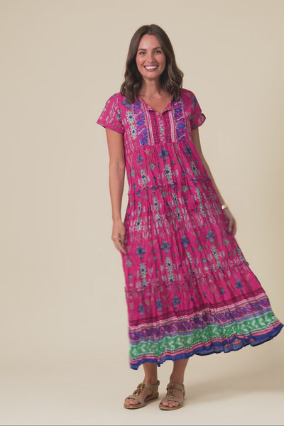 Nona Fuchsia Mosaic Crinkle Cotton Maxi Dress