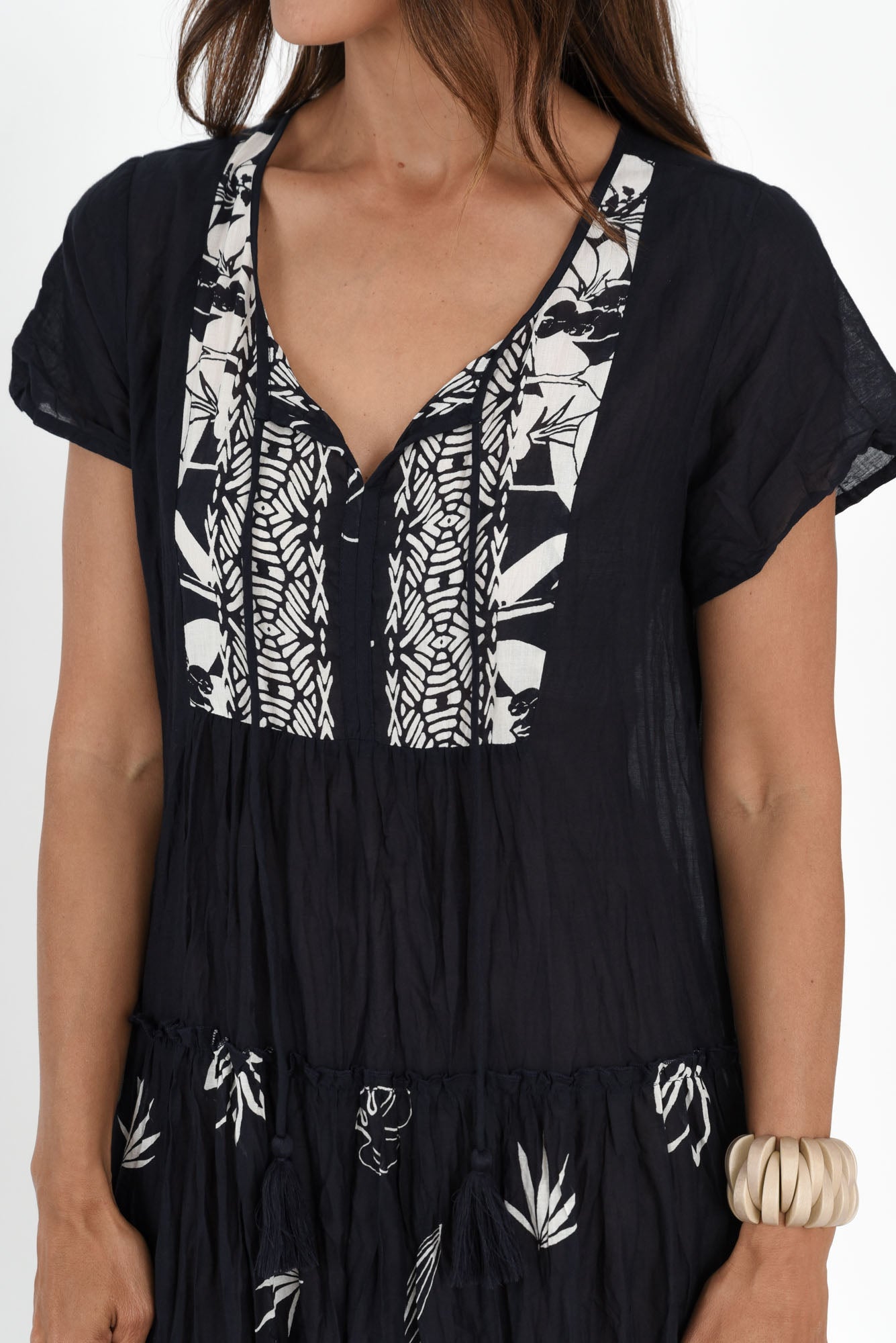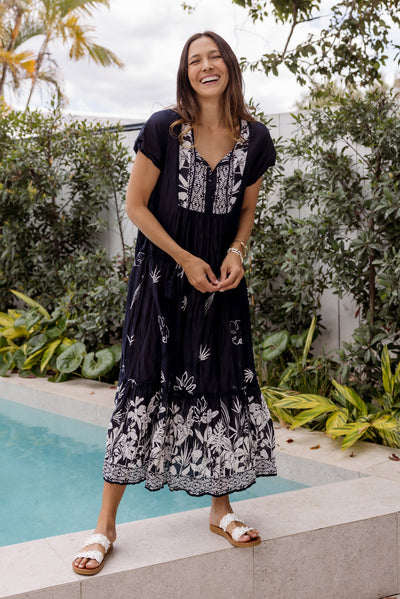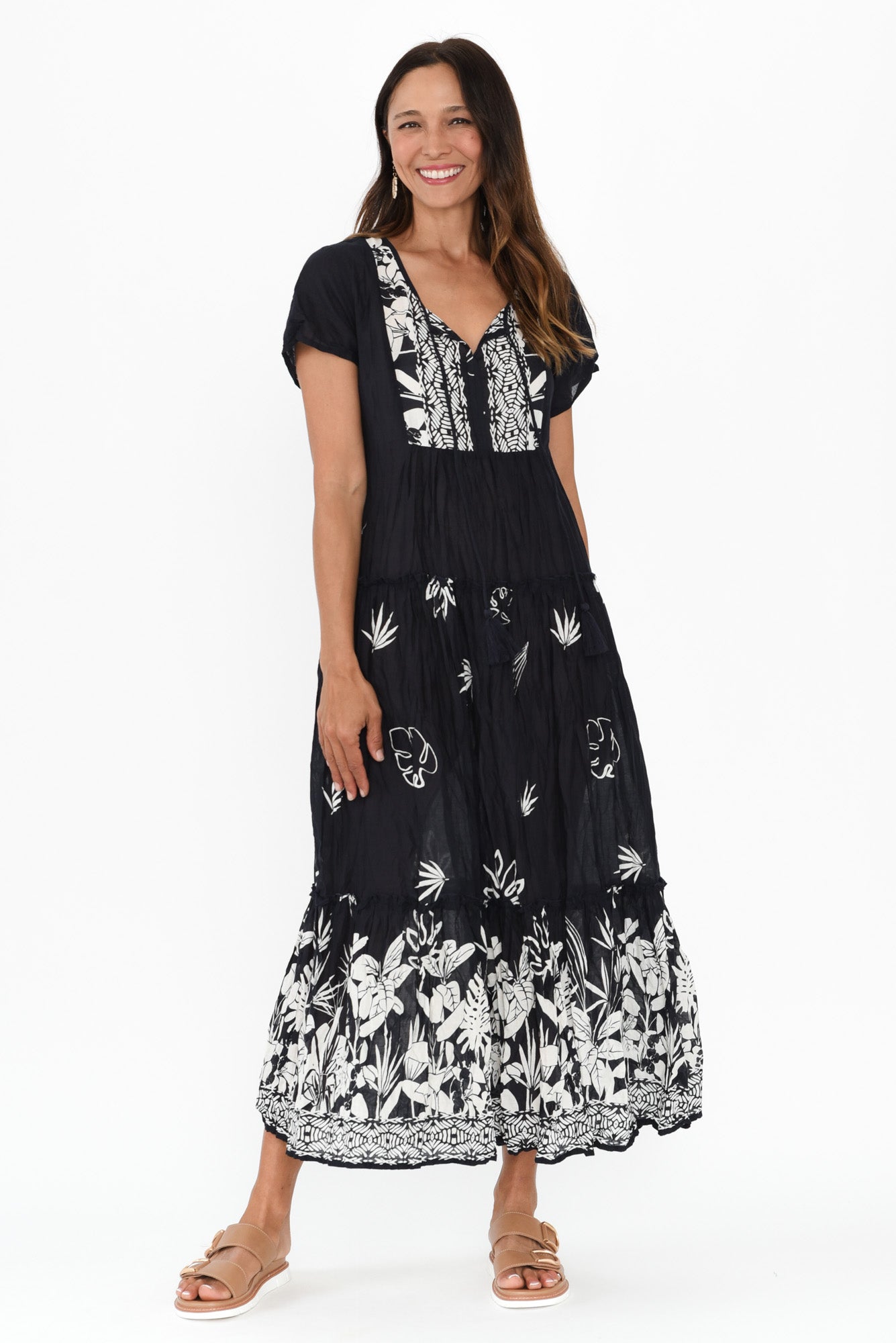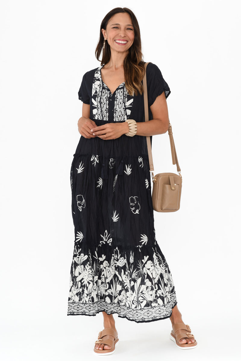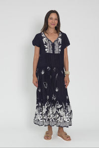 Nona Navy Botanical Crinkle Cotton Maxi Dress