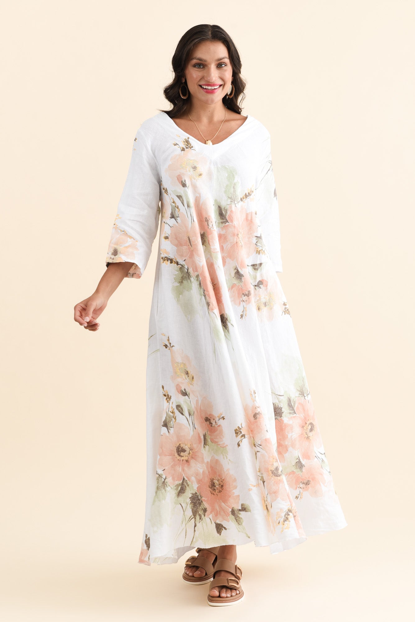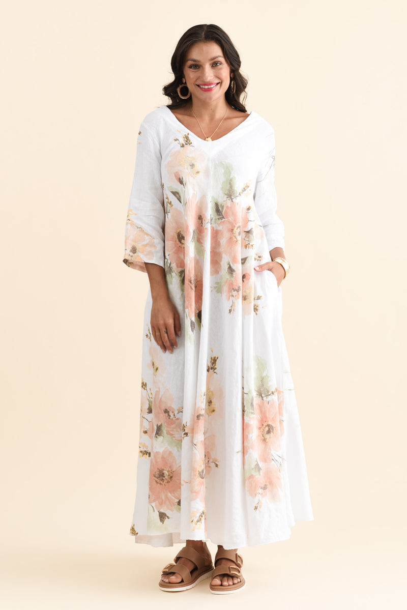 OSCAR WHITE FLORAL LINEN MAXI DRESS