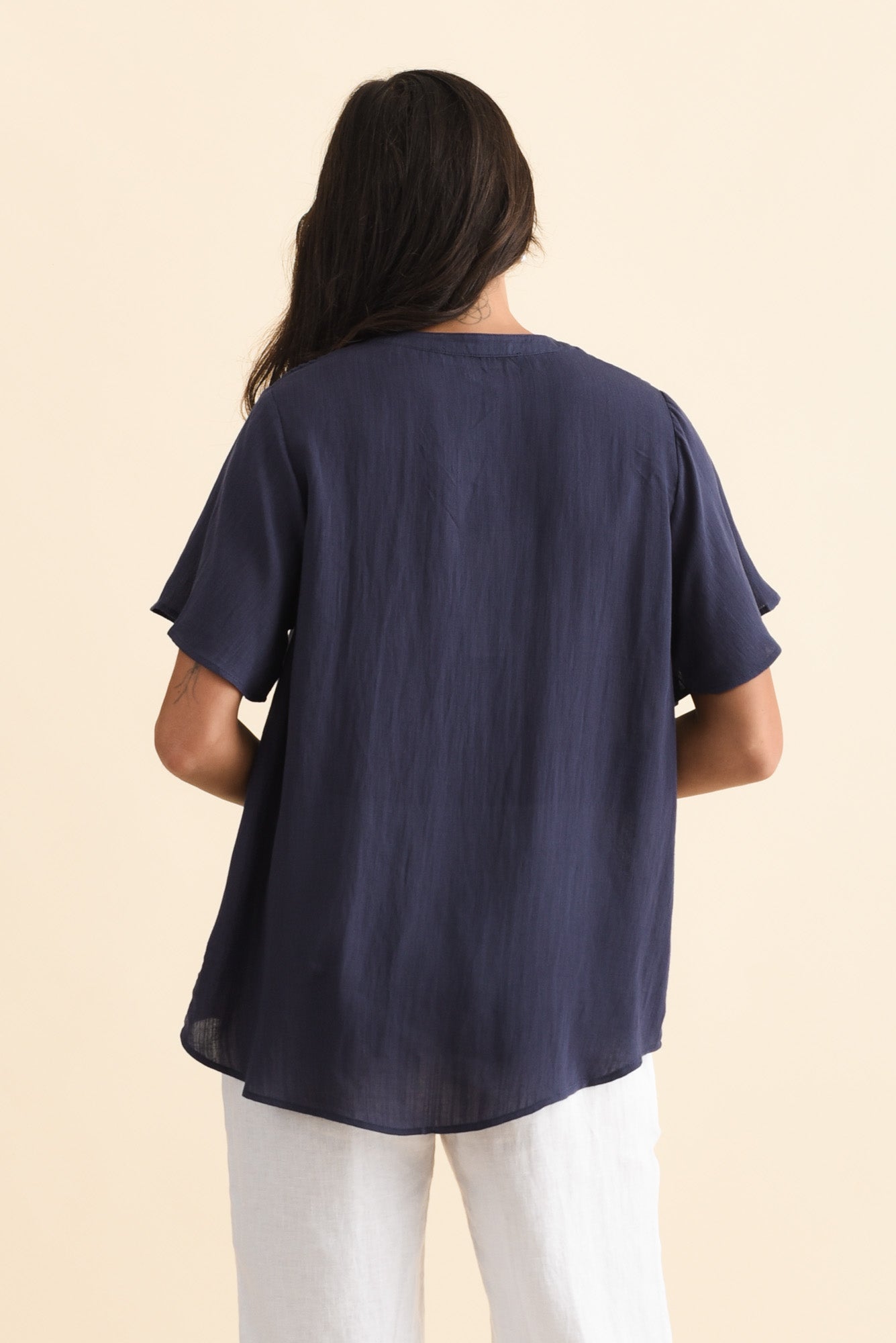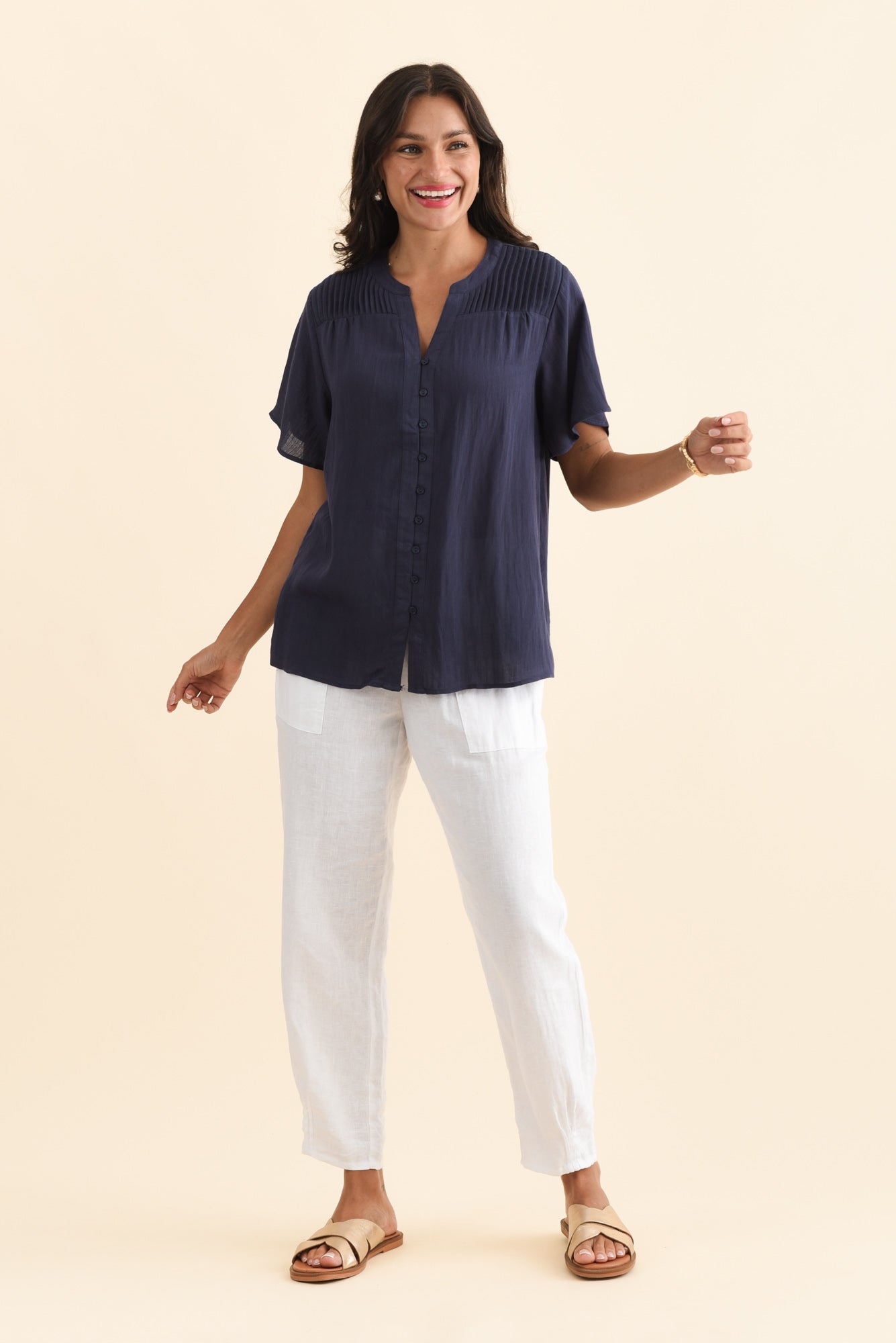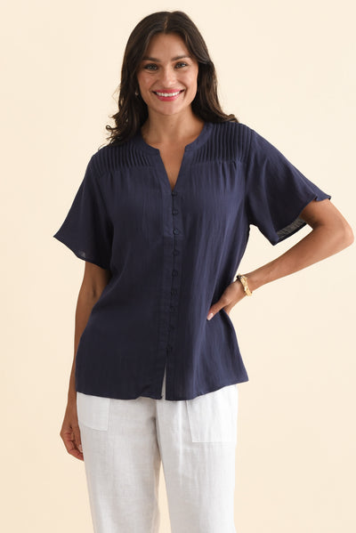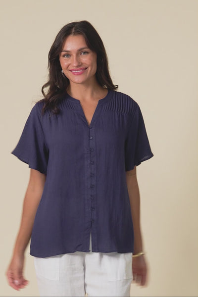Ponny Navy Linen Blend Button Top