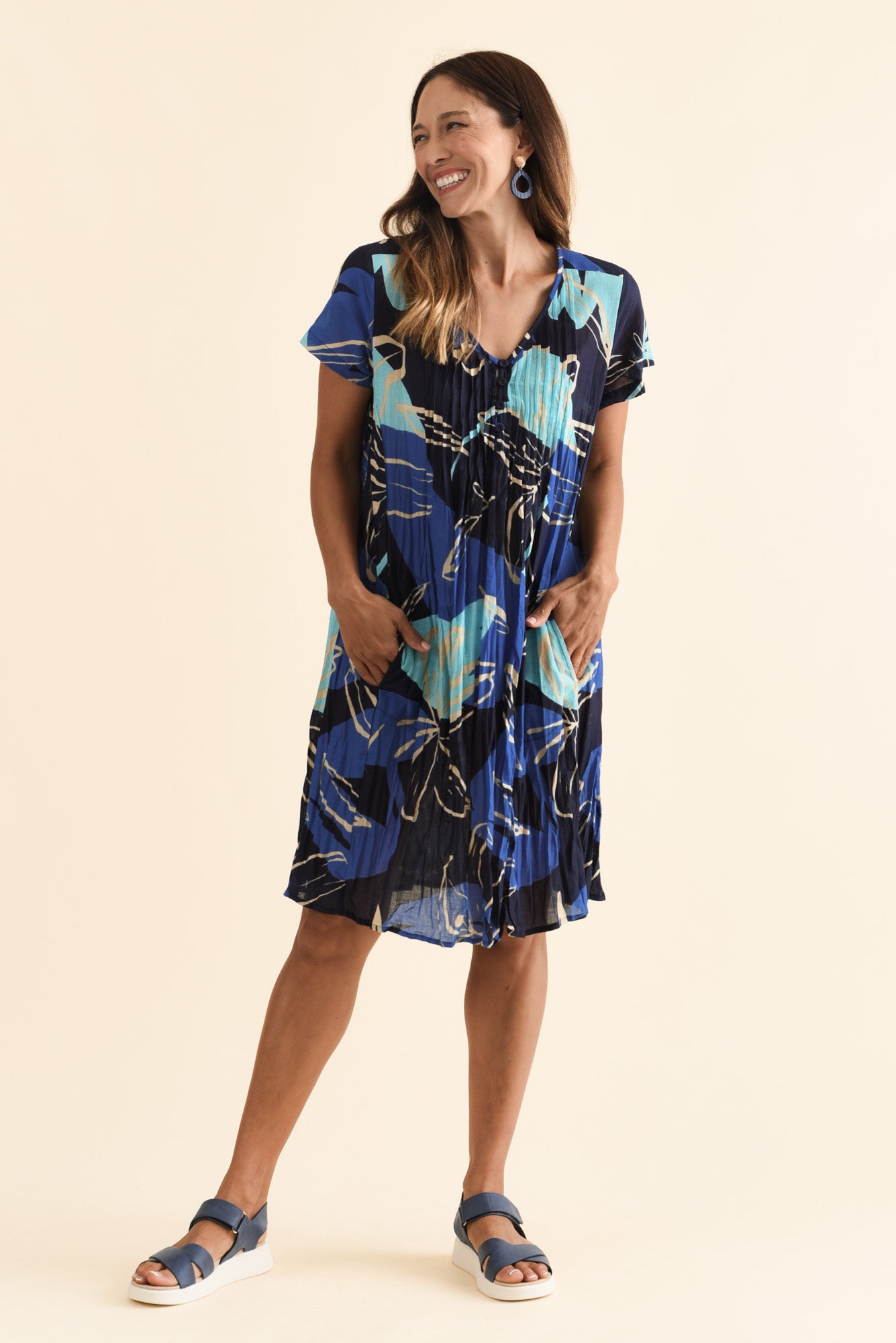 SABINA BLUE TIGER LILY CRINKLE COTTON DRESS