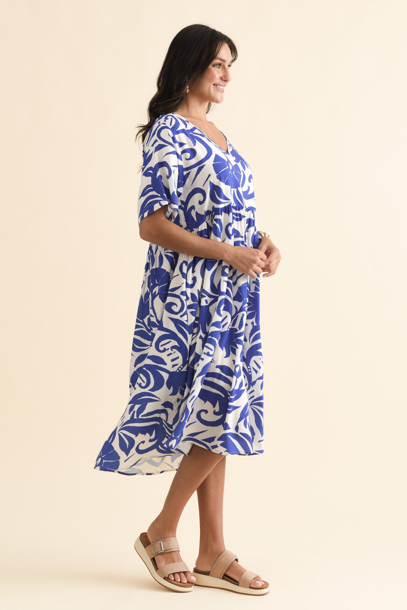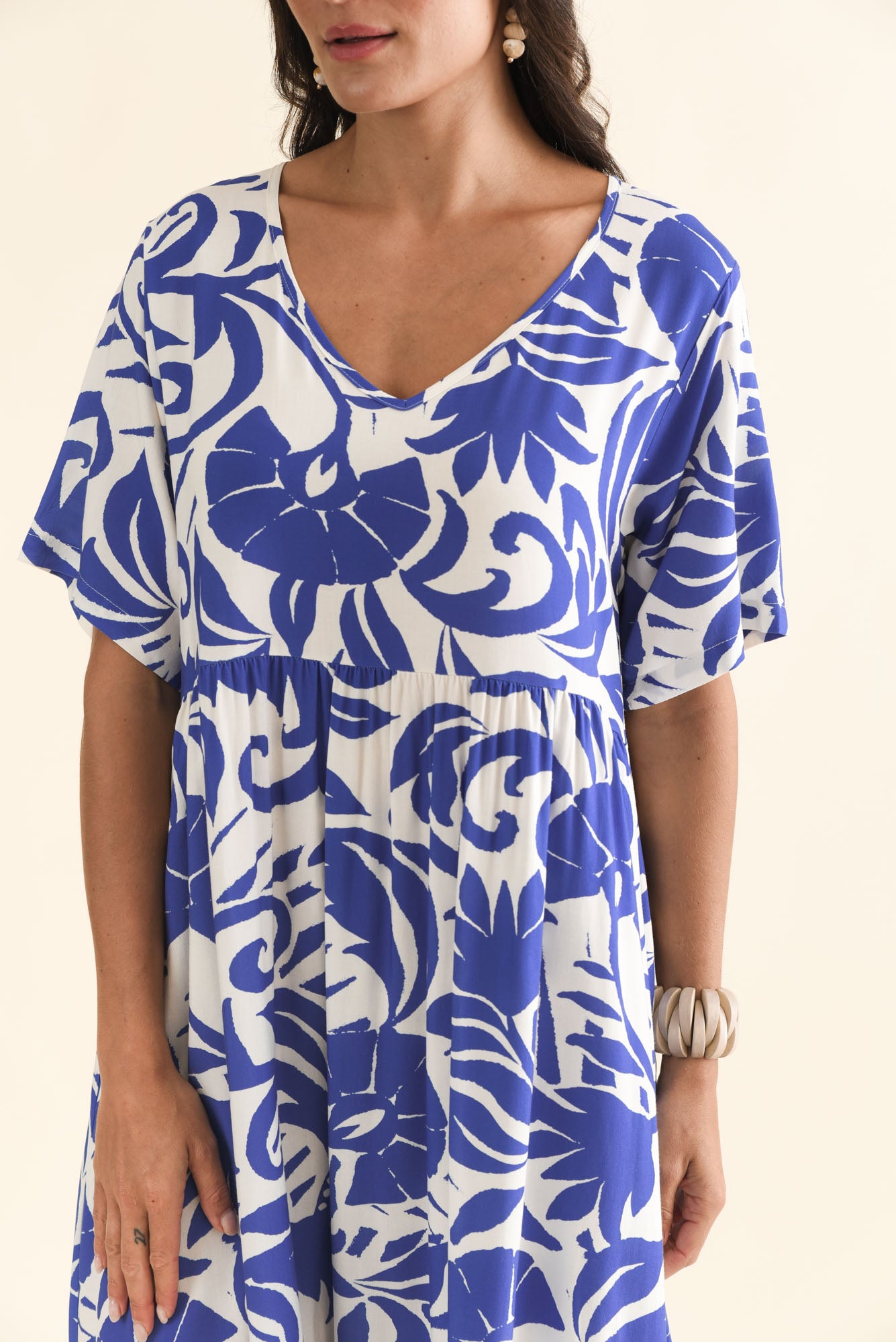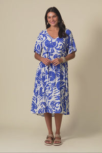 SHARLENE BLUE BOTANICAL MIDI DRESS