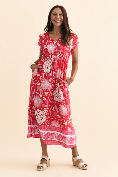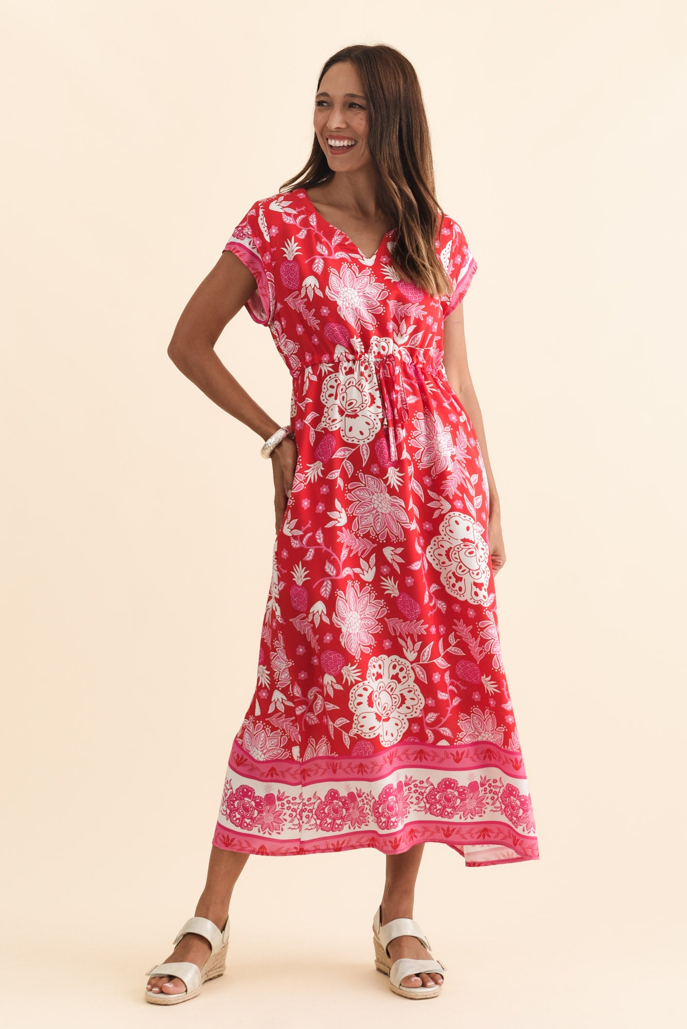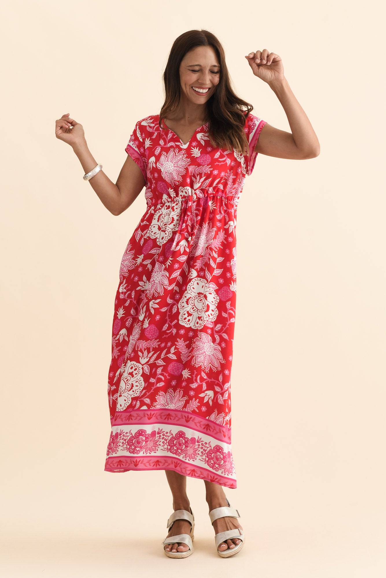 Graceful A-line silhouette features a fitted waist with an adjustable drawstring, creating a flattering and comfortable shape