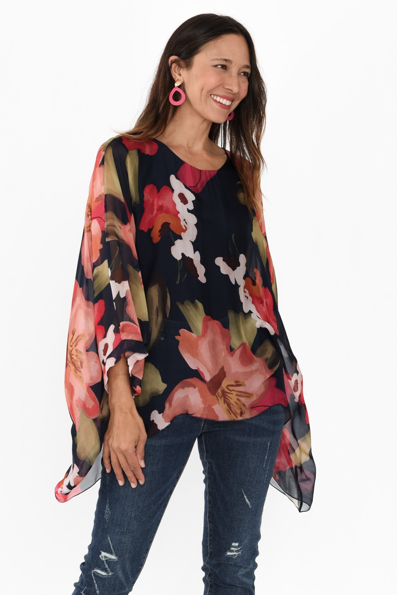 TREVINO NAVY PETAL SILK OVERLAY TOP