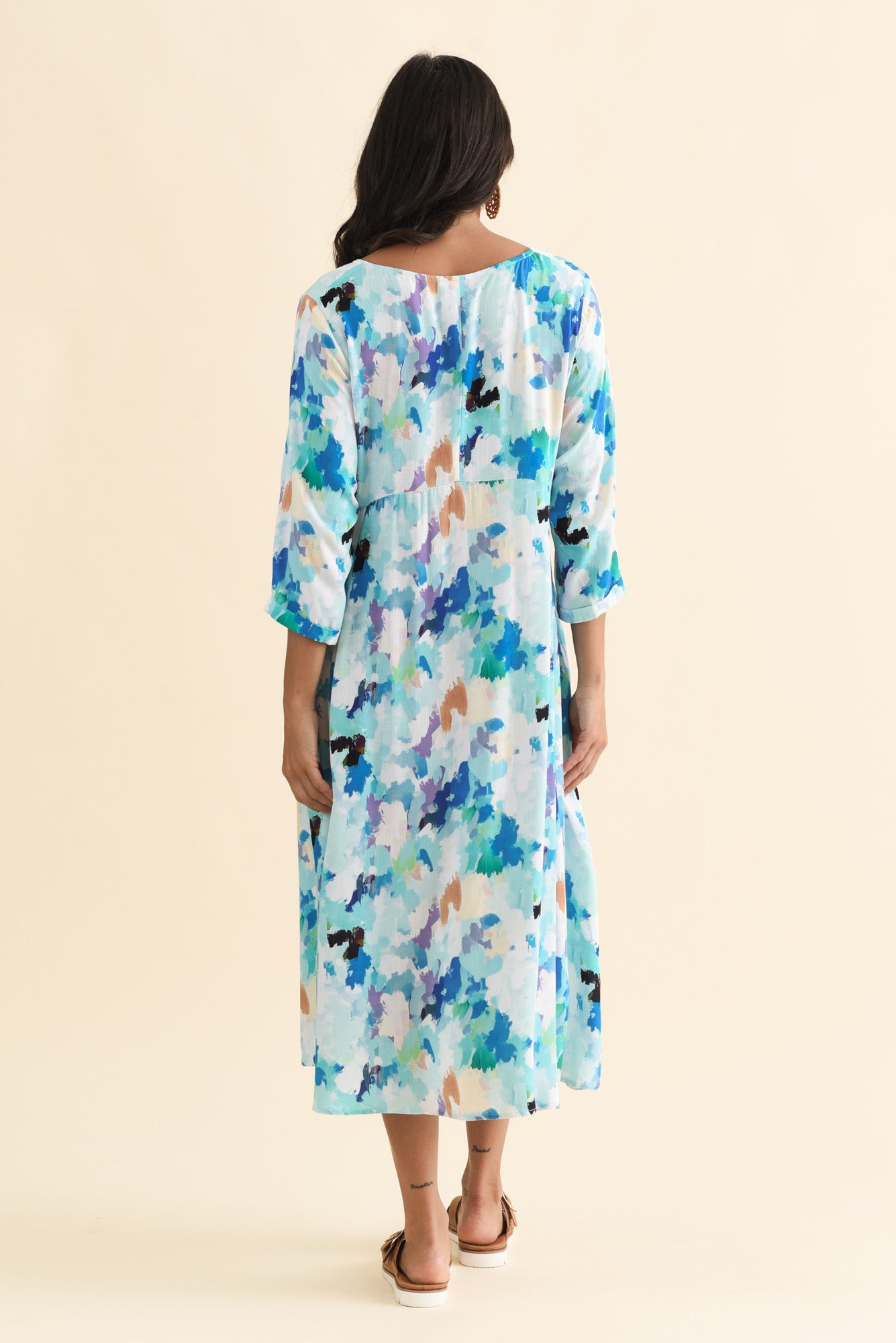 ZAELIA BLUE WATERCOLOUR SLEEVED CRESCENT DRESS