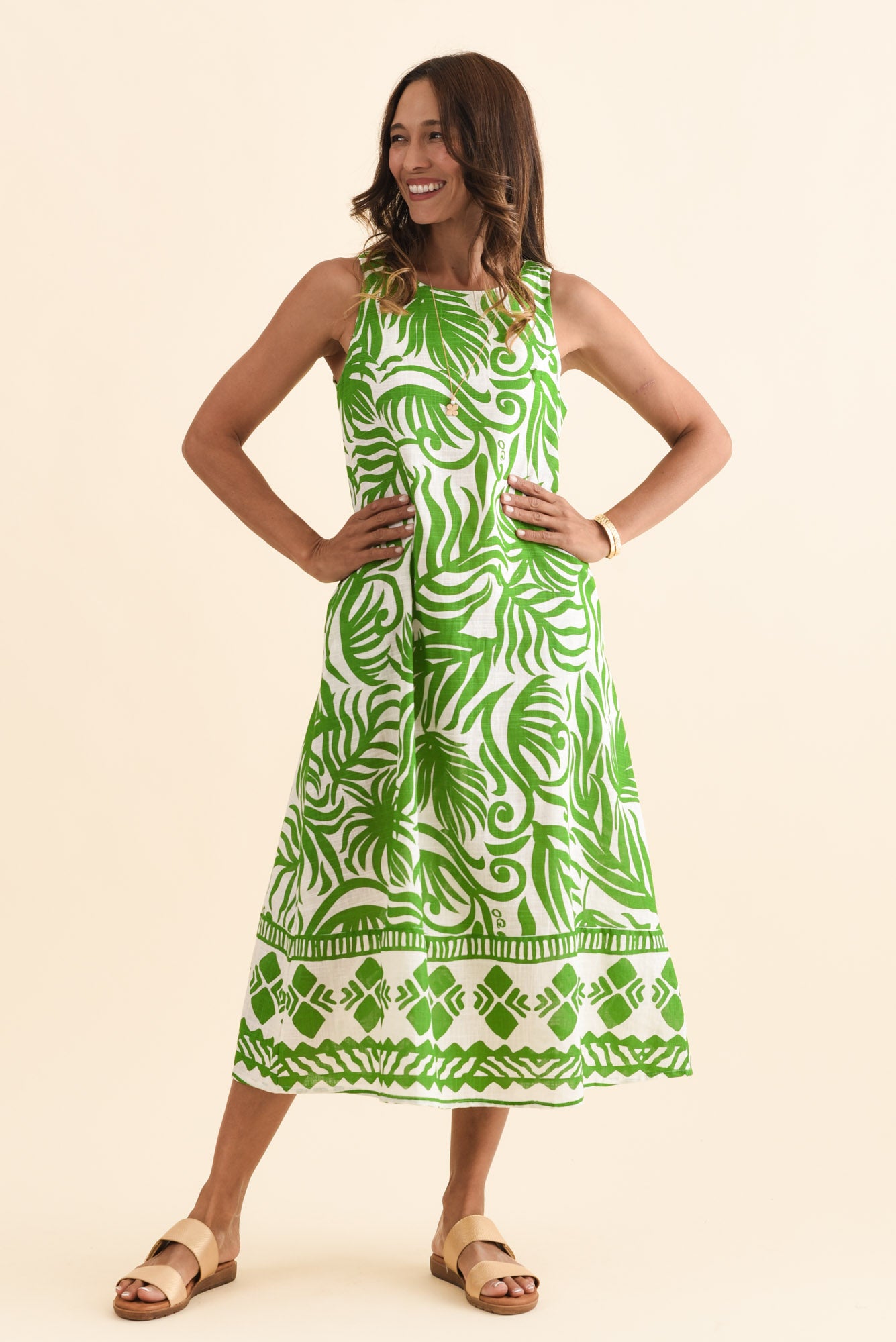 ZELDI GREEN LEAF COTTON MIDI DRESS